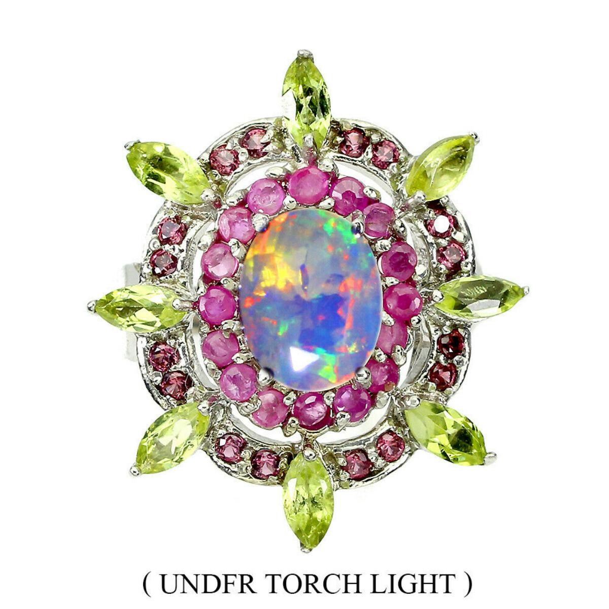 925 STERLING SILVER;PLATE-14K WHITE GOLD;RING SIZE-8.5(RESIZEABLE);MAIN STONE-FIRE OPAL;OTHER GEMS-PERIDOT, RHODOLITE GARNET, RUBY;TOTAL WEIGHT-5.98 GRAM (TOTAL WEIGHT OF SILVER + STONE);DIMENSION-* STONE 1.0 TO 8.0 X 6.0 MM. * RING SIZE 8.5 * FACE RING 25.0 X 21.0 MM.;MAIN STONE SHAPE-OVAL CUT;MAIN STONE COLORRAINBOW FULL FLASH;CLARITY/GRADE-IF;TREATMENT-UNHEATED;ORIGIN-ETHIOPIA;HARDNESS-5;