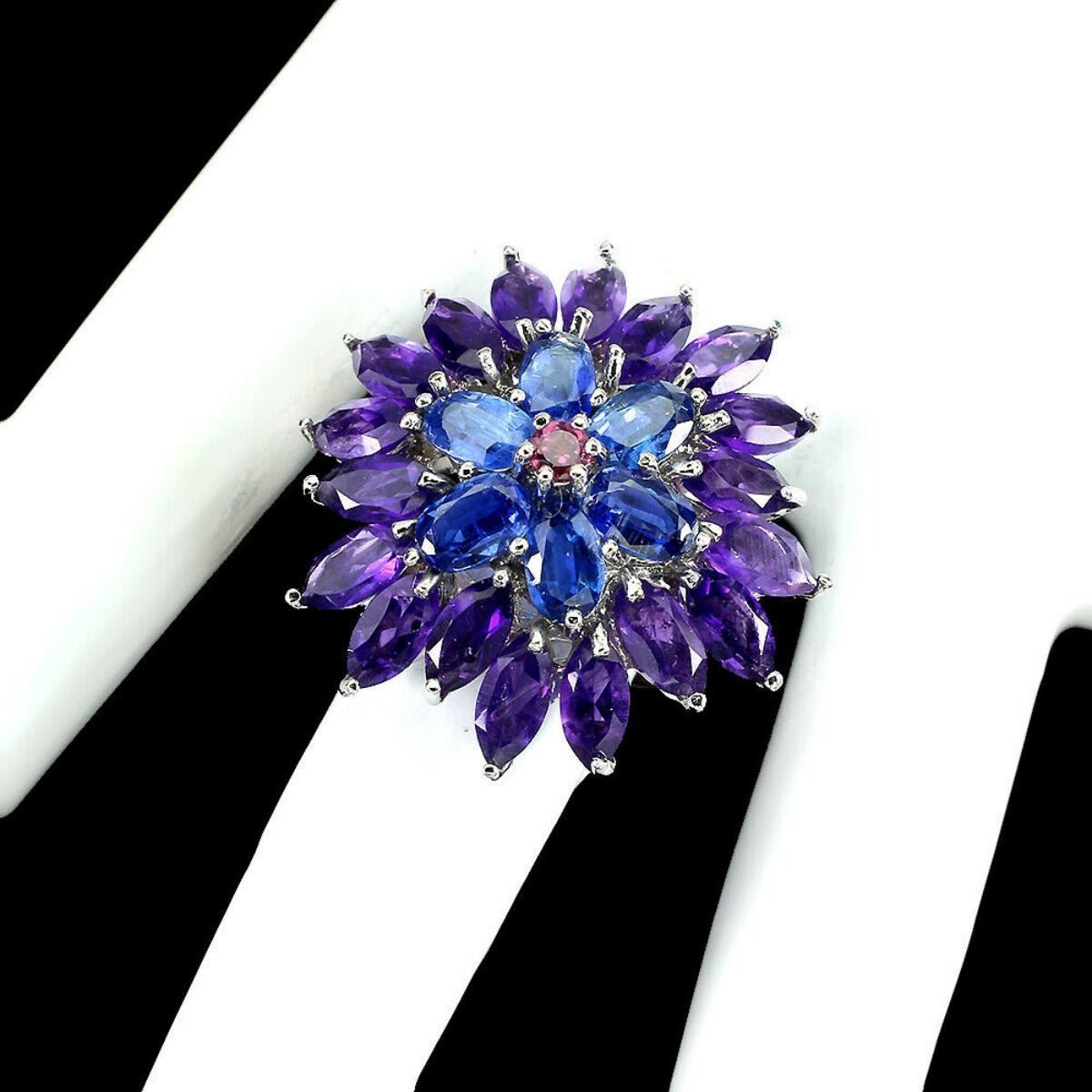 925 STERLING SILVER;PLATE-14K WHITE GOLD;RING SIZE-7(RESIZABLE);MAIN STONE-KYANITE;OTHER GEMS-AMETHYST, RHODOLITE GARNET;TOTAL WEIGHT-10.65 GRAM (TOTAL WEIGHT OF SILVER + STONE);DIMENSION-* STONE 3.5 TO 7.0 X 3.5 MM. * RING SIZE 7.0 * FACE RING 28.0 X 28.0 MM.;MAIN STONE SHAPE-OVAL CUT;MAIN STONE COLOR-CORNFLOWER BLUE;CLARITY/GRADE-IF TO VVS;TREATMENT-UNHEATED;ORIGIN-NEPAL;HARDNESS-5;