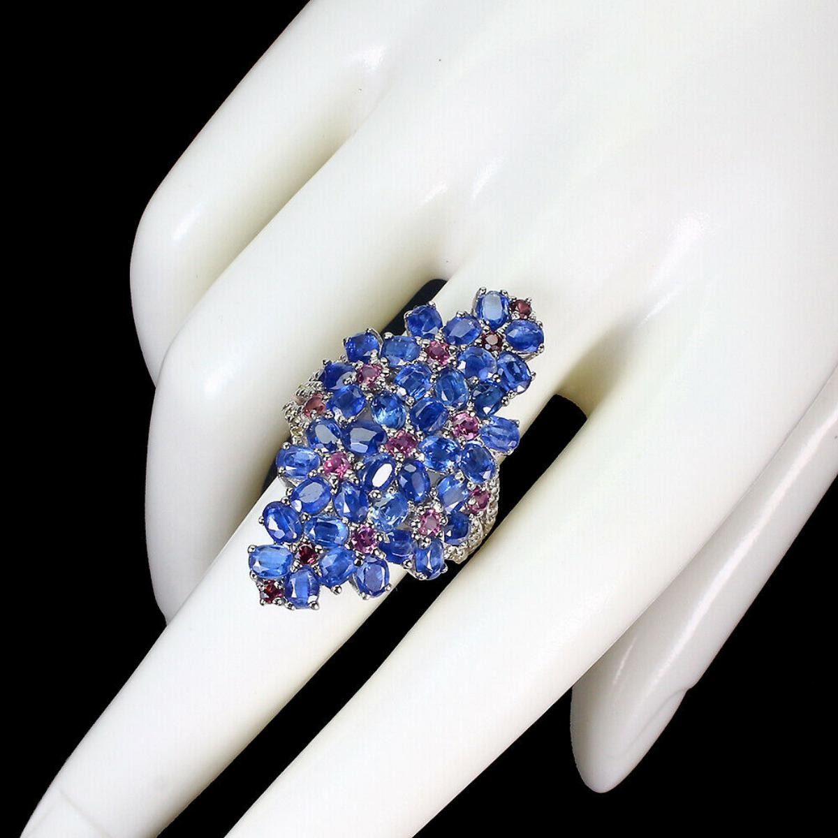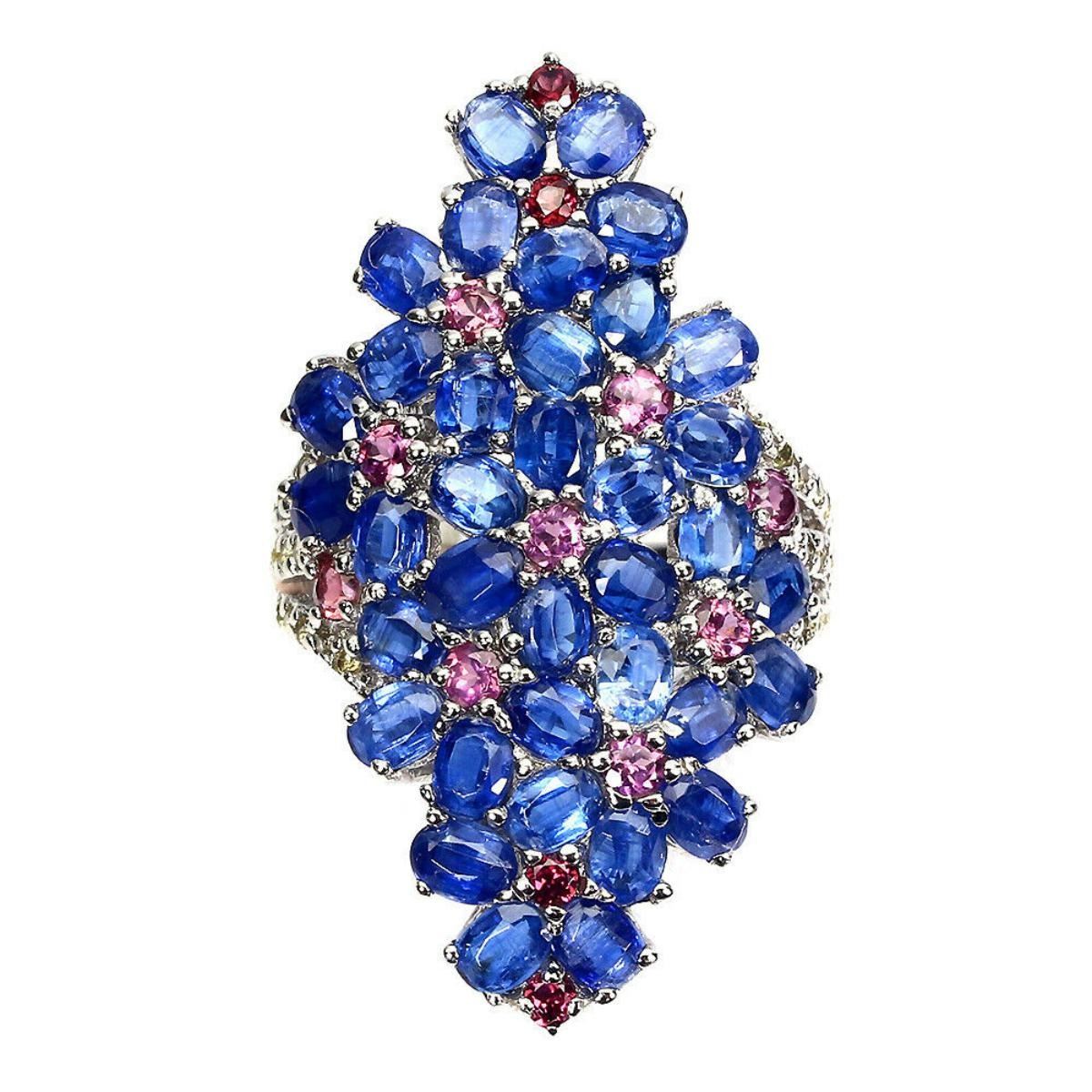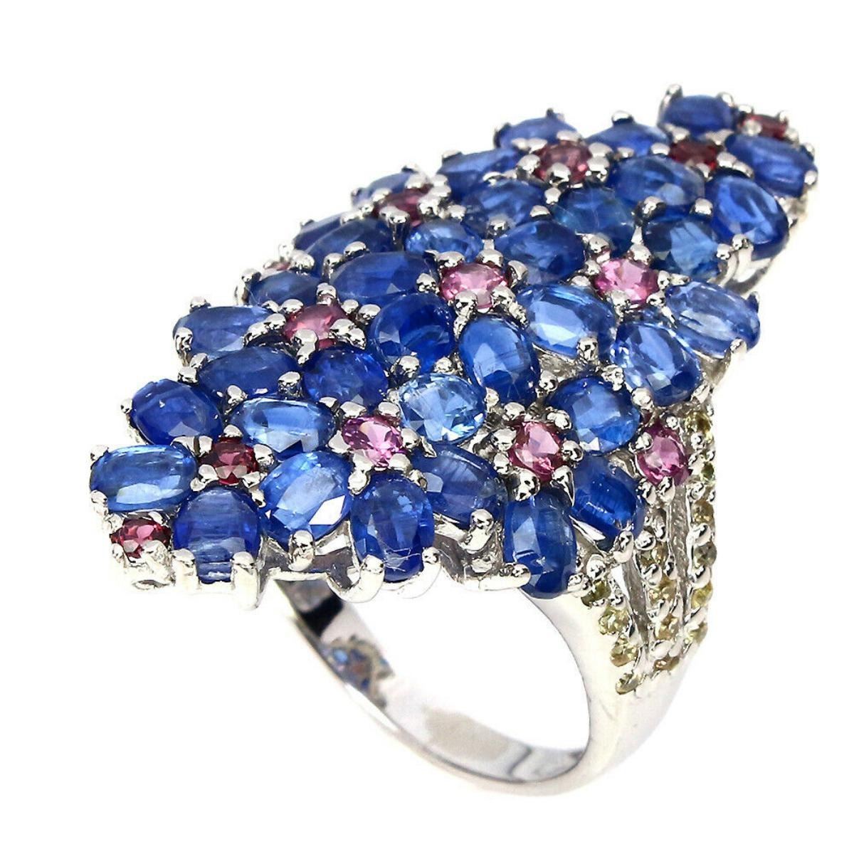 925 STERLING SILVER;PLATE-14K WHITE GOLD;RING SIZE-8(RESIZABLE);MAIN STONE-KYANITE;OTHER GEMS-RHODOLITE GARNET, SAPPHIRE;TOTAL WEIGHT-7.86 GRAM (TOTAL WEIGHT OF SILVER + STONE);DIMENSION-* STONE 1.5 TO 4.0 X 3.0 MM. * RING SIZE 8.0 * FACE RING 38.0 X 23.0 MM.;MAIN STONE SHAPE-OVAL CUT;MAIN STONE COLOR- BLUE;CLARITY/GRADE-IF TO VVS;TREATMENT-UNHEATED;ORIGIN-AFRICA;HARDNESS-5;