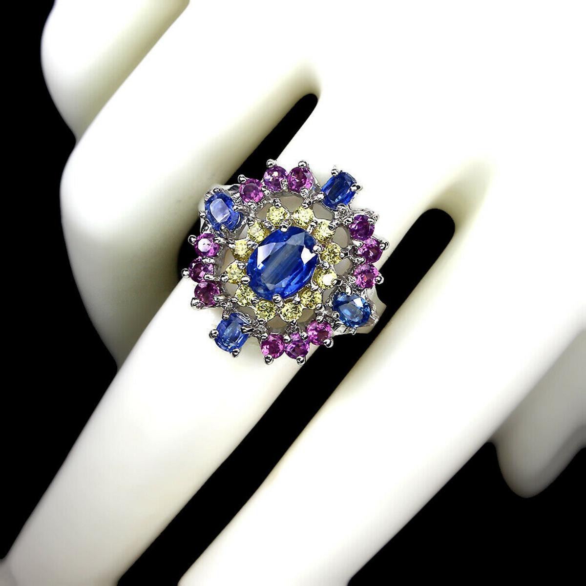 925 STERLING SILVER;PLATE-14K WHITE GOLD;RING SIZE-9(RESIZABLE);MAIN STONE-KYANITE;OTHER GEMS-RHODOLITE GARNET, SAPPHIRE;TOTAL WEIGHT-8.02 GRAM (TOTAL WEIGHT OF SILVER + STONE);DIMENSION-* STONE 2.0 TO 8.0 X 6.0 MM. * RING SIZE 9.0 * FACE RING 22.0 X 20.0 MM.;MAIN STONE SHAPE-OVAL CUT;MAIN STONE COLOR-CORNFLOWER BLUE;CLARITY/GRADE-IF TO VVS;TREATMENT-UNHEATED;ORIGIN-NEPAL;HARDNESS-5;
