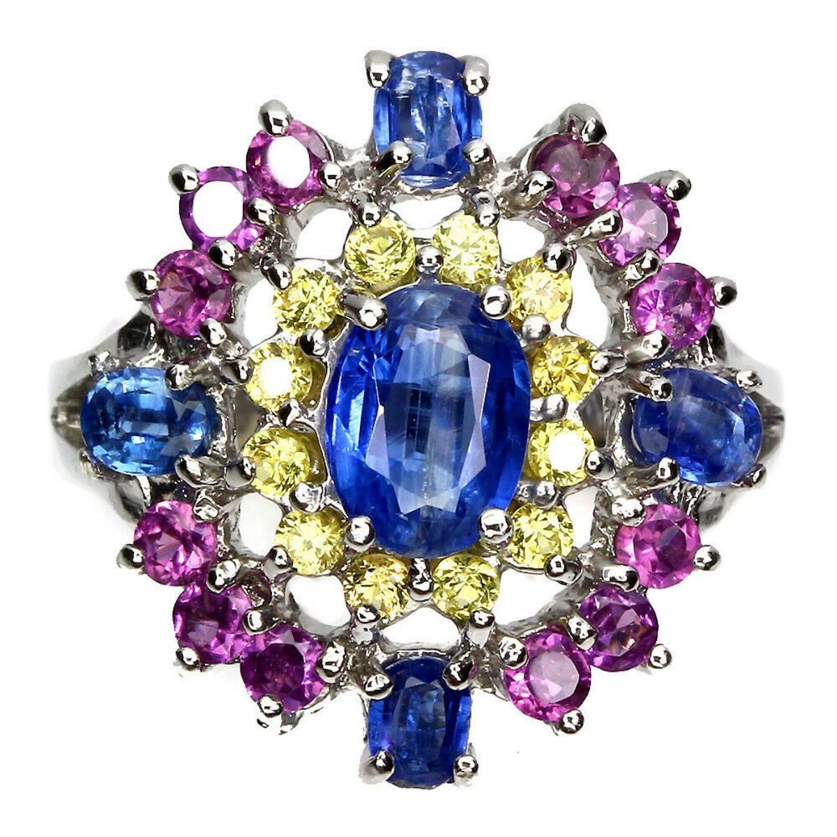925 STERLING SILVER;PLATE-14K WHITE GOLD;RING SIZE-9(RESIZABLE);MAIN STONE-KYANITE;OTHER GEMS-RHODOLITE GARNET, SAPPHIRE;TOTAL WEIGHT-8.02 GRAM (TOTAL WEIGHT OF SILVER + STONE);DIMENSION-* STONE 2.0 TO 8.0 X 6.0 MM. * RING SIZE 9.0 * FACE RING 22.0 X 20.0 MM.;MAIN STONE SHAPE-OVAL CUT;MAIN STONE COLOR-CORNFLOWER BLUE;CLARITY/GRADE-IF TO VVS;TREATMENT-UNHEATED;ORIGIN-NEPAL;HARDNESS-5;
