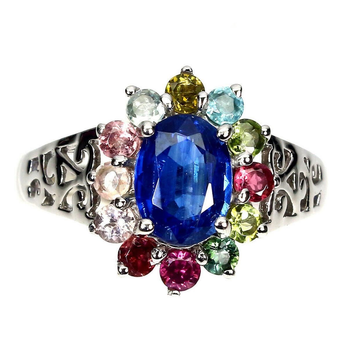 925 STERLING SILVER;PLATE-14K WHITE GOLD;RING SIZE-8(RESIZABLE);MAIN STONE-KYANITE;OTHER GEMS-TOURMALINE;TOTAL WEIGHT-4.44 GRAM (TOTAL WEIGHT OF SILVER + STONE);DIMENSION-* STONE 2.5 TO 8.0 X 6.0 MM. * RING SIZE 8.0 * FACE RING 14.0 X 12.0 MM;MAIN STONE SHAPE-OVAL CUT;MAIN STONE COLOR- BLUE;CLARITY/GRADE-IF TO VVS;TREATMENT-UNHEATED;ORIGIN- NEPAL;HARDNESS- 5;