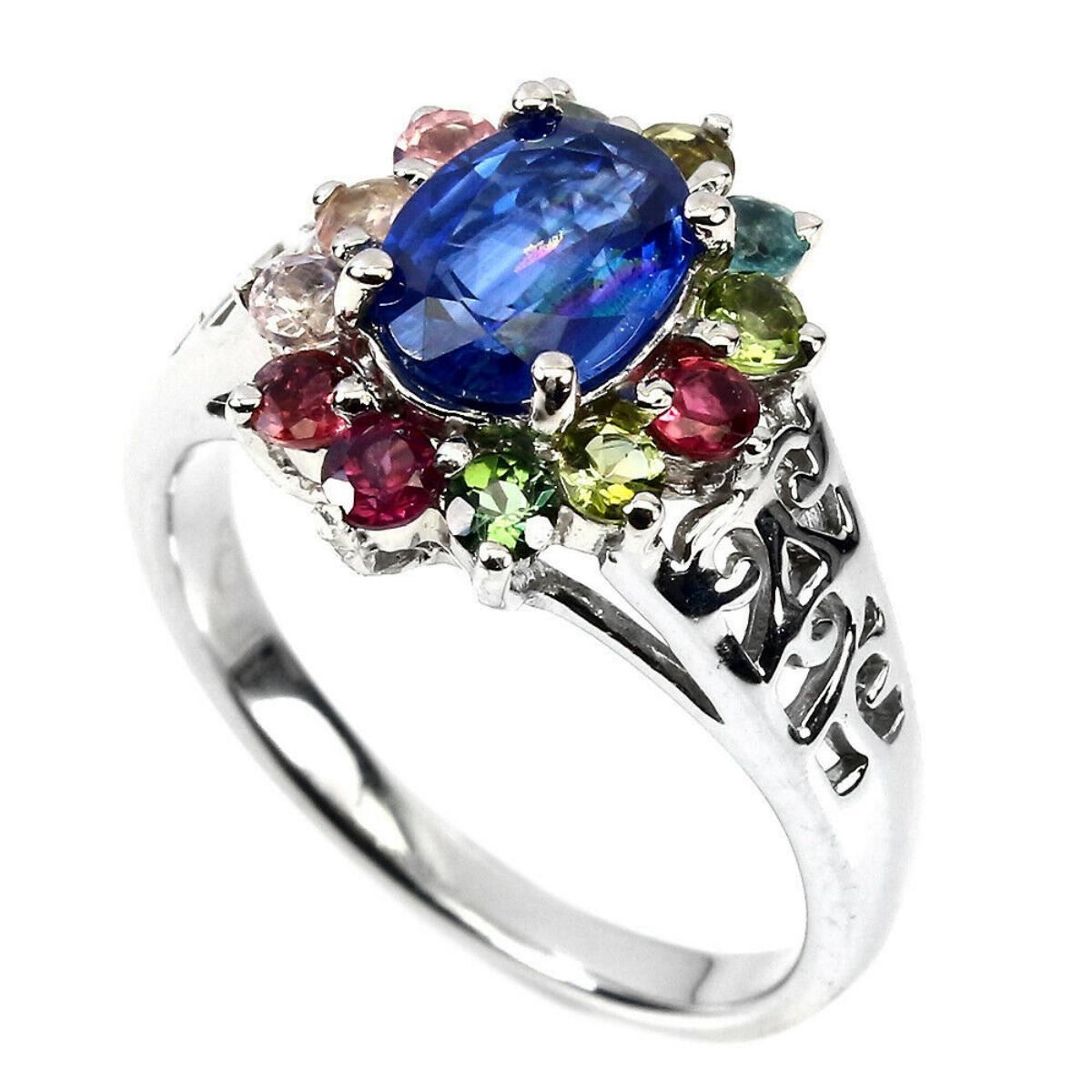925 STERLING SILVER;PLATE-14K WHITE GOLD;RING SIZE-8(RESIZABLE);MAIN STONE-KYANITE;OTHER GEMS-TOURMALINE;TOTAL WEIGHT-4.44 GRAM (TOTAL WEIGHT OF SILVER + STONE);DIMENSION-* STONE 2.5 TO 8.0 X 6.0 MM. * RING SIZE 8.0 * FACE RING 14.0 X 12.0 MM;MAIN STONE SHAPE-OVAL CUT;MAIN STONE COLOR- BLUE;CLARITY/GRADE-IF TO VVS;TREATMENT-UNHEATED;ORIGIN- NEPAL;HARDNESS- 5;