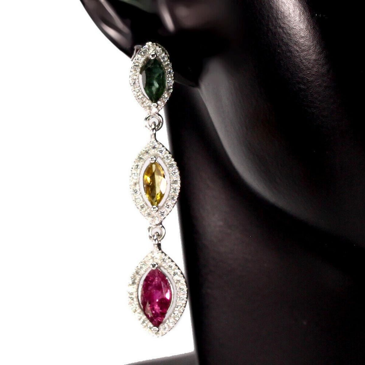 925 STERLING SILVER;PLATE-14K WHITE GOLD;MAIN STONE-TOURMALINE;TOTAL WEIGHT-5.35 CT (TOTAL WEIGHT OF SILVER + STONE)DIMENSION* STONE 6.0 X 3.0 TO 8.0 X 4.0 MM. * CZ 1.0 MM. * FACE EARRINGS -42.0 X 8.0 MM.MAIN STONE SHAPE-MARQUISE CUTMAIN STONE COLOR-MULTI-COLORTREATMENT-UNHEATED;ORIGIN-BRAZIL;HARDNESS-7.0-7.5;