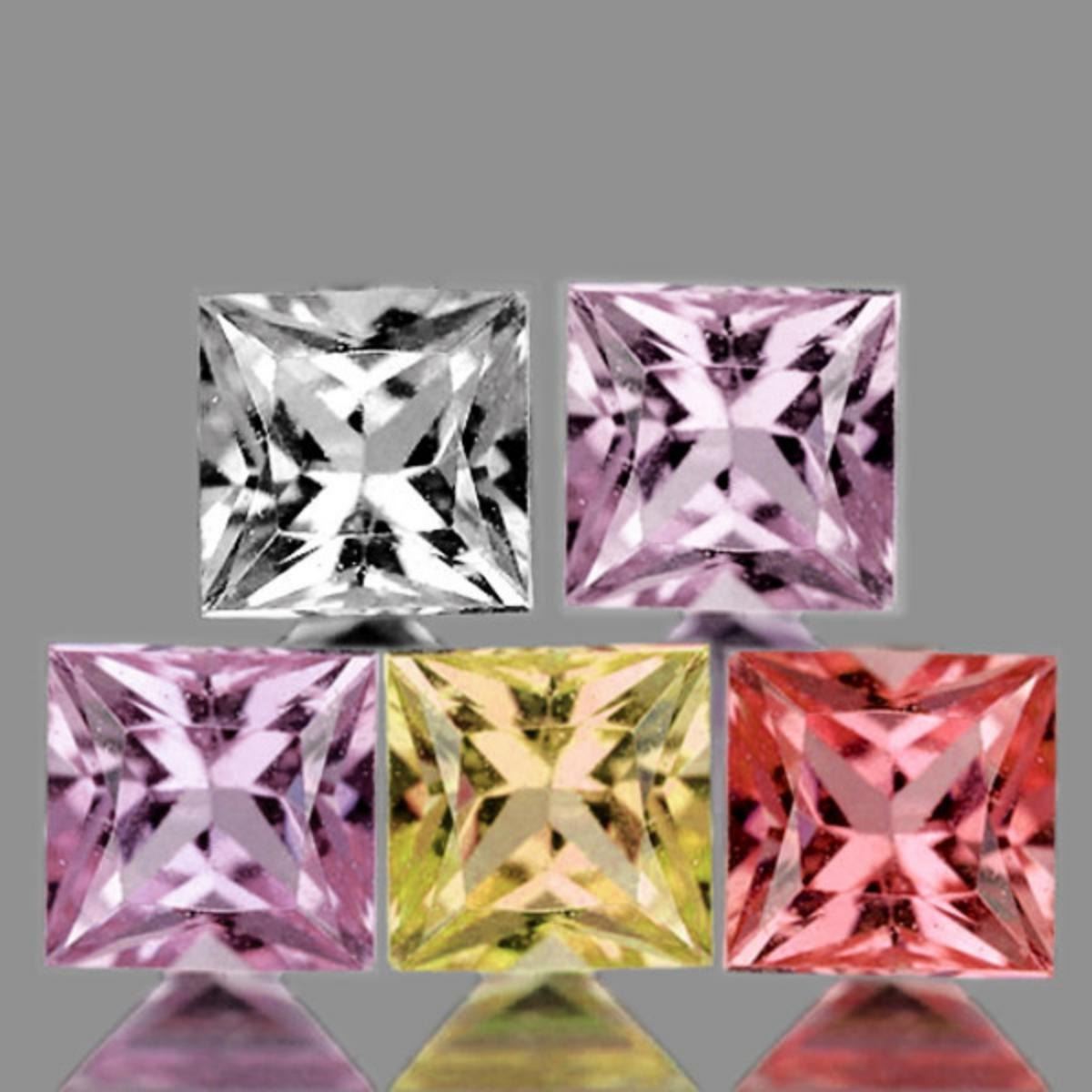 Natural Sapphire (Earthly mined)SIZE ( L x W x D ) : 3.20 mm;COLOR : Multi Color;(Shades of Pink, White, Yellow, Purple, Green, Orange)SHAPE : Square;QUANTITY : 5 pieces ;LUSTER : Excellent;CLARITY : Flawless-VVS;HARDNESS : 9;ORIGIN : Mozambique; TREATMENT : Unheated/Untreated