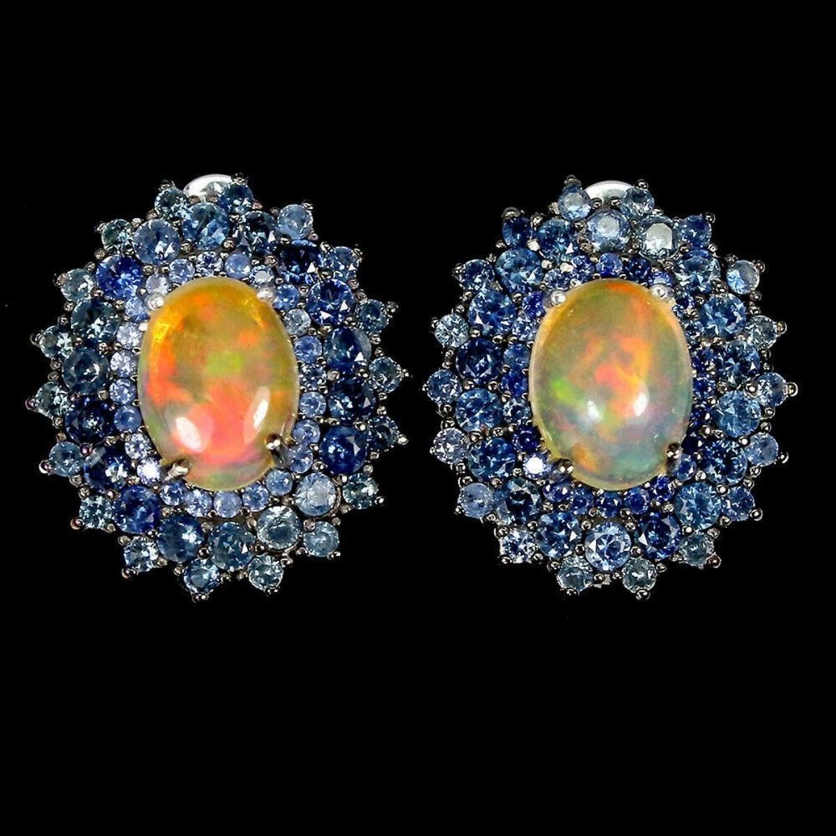 925 STERLING SILVER;PLATE-2-TONE BLACK RHODIUM & WHITE 14K GOLD;MAIN STONE-FIRE OPAL;OTHER GEMS-SAPPHIRE;TOTAL WEIGHT-4.29 GRAM (TOTAL WEIGHT OF SILVER + STONE)DIMENSION-* STONE 1.0 TO 8.0 X 6.0 MM. * FACE EARRINGS 16.0 X 14.0 MM.;MAIN STONE SHAPE-OVAL CABOCHON;MAIN STONE COLOR-HOT RAINBOW LUSTER;TREATMENT-UNHEATED;ORIGIN-ETHIOPIA;HARDNESS-5;