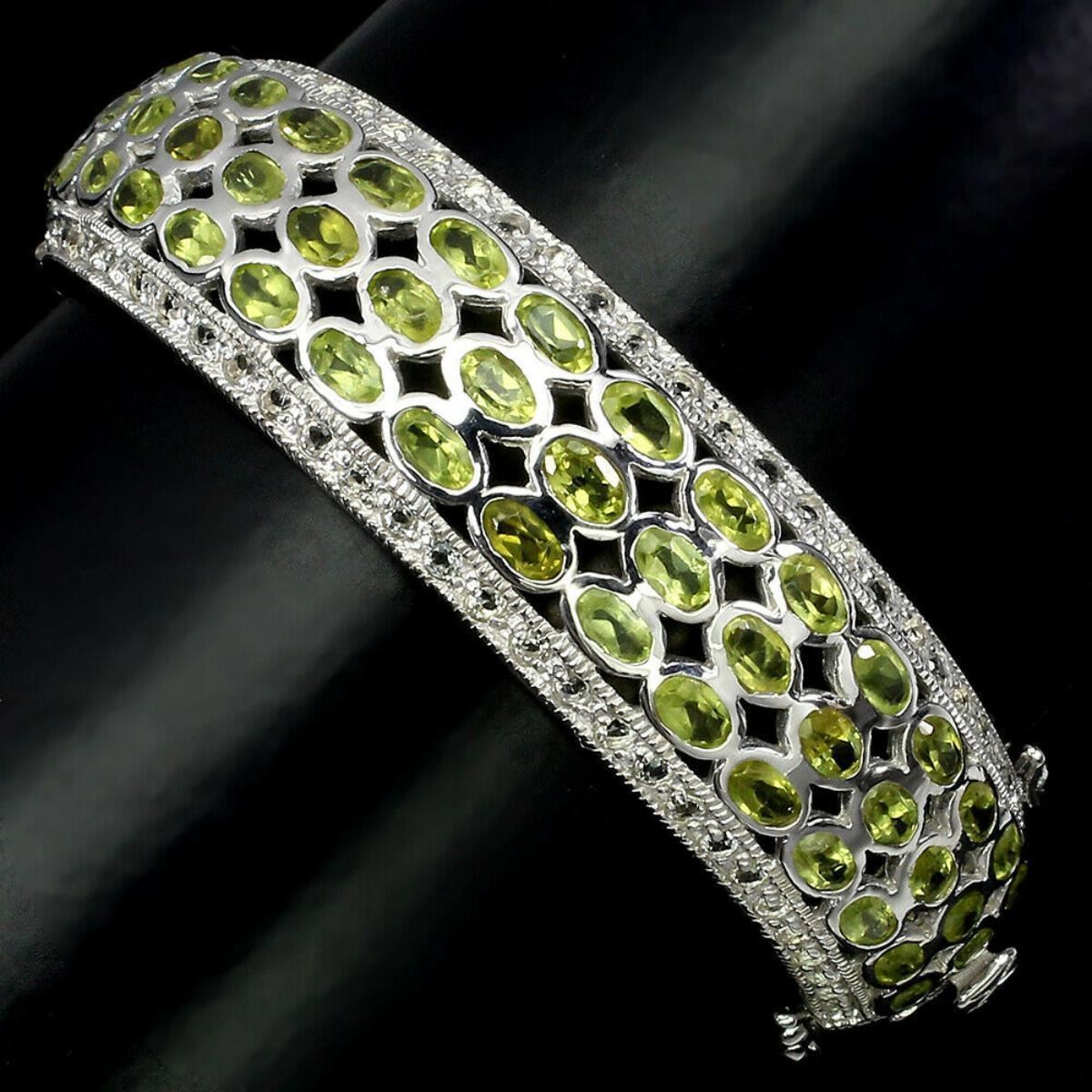 925 STERLING SILVER;PLATE-14K WHITE GOLD;MAIN STONE-PERIDOT;OTHER GEMS-WHITE TOPAZ;TOTAL WEIGHT-50.82 GRAM (TOTAL WEIGHT OF SILVER + STONE)DIMENSION* STONE 2.0 TO 5.0 X 3.0 MM. * DIAMETER 2.2 X 2.1 INCHES. * FACE BANGLE 70.0 X 18.0 MM.;MAIN STONE SHAPE-OVAL CUT;MAIN STONE COLOR-TOP RICH GREEN;CLARITY/GRADE-IF TO VVS;TREATMENT-UNHEATED;ORIGIN-PAKISTAN;HARDNESS-6.5 - 7.0;