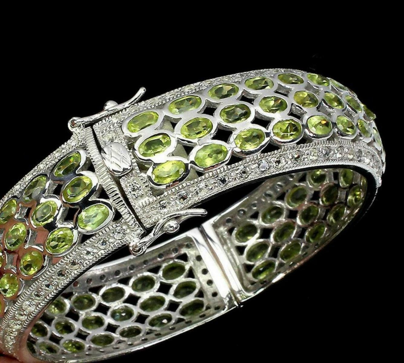 925 STERLING SILVER;PLATE-14K WHITE GOLD;MAIN STONE-PERIDOT;OTHER GEMS-WHITE TOPAZ;TOTAL WEIGHT-50.82 GRAM (TOTAL WEIGHT OF SILVER + STONE)DIMENSION* STONE 2.0 TO 5.0 X 3.0 MM. * DIAMETER 2.2 X 2.1 INCHES. * FACE BANGLE 70.0 X 18.0 MM.;MAIN STONE SHAPE-OVAL CUT;MAIN STONE COLOR-TOP RICH GREEN;CLARITY/GRADE-IF TO VVS;TREATMENT-UNHEATED;ORIGIN-PAKISTAN;HARDNESS-6.5 - 7.0;