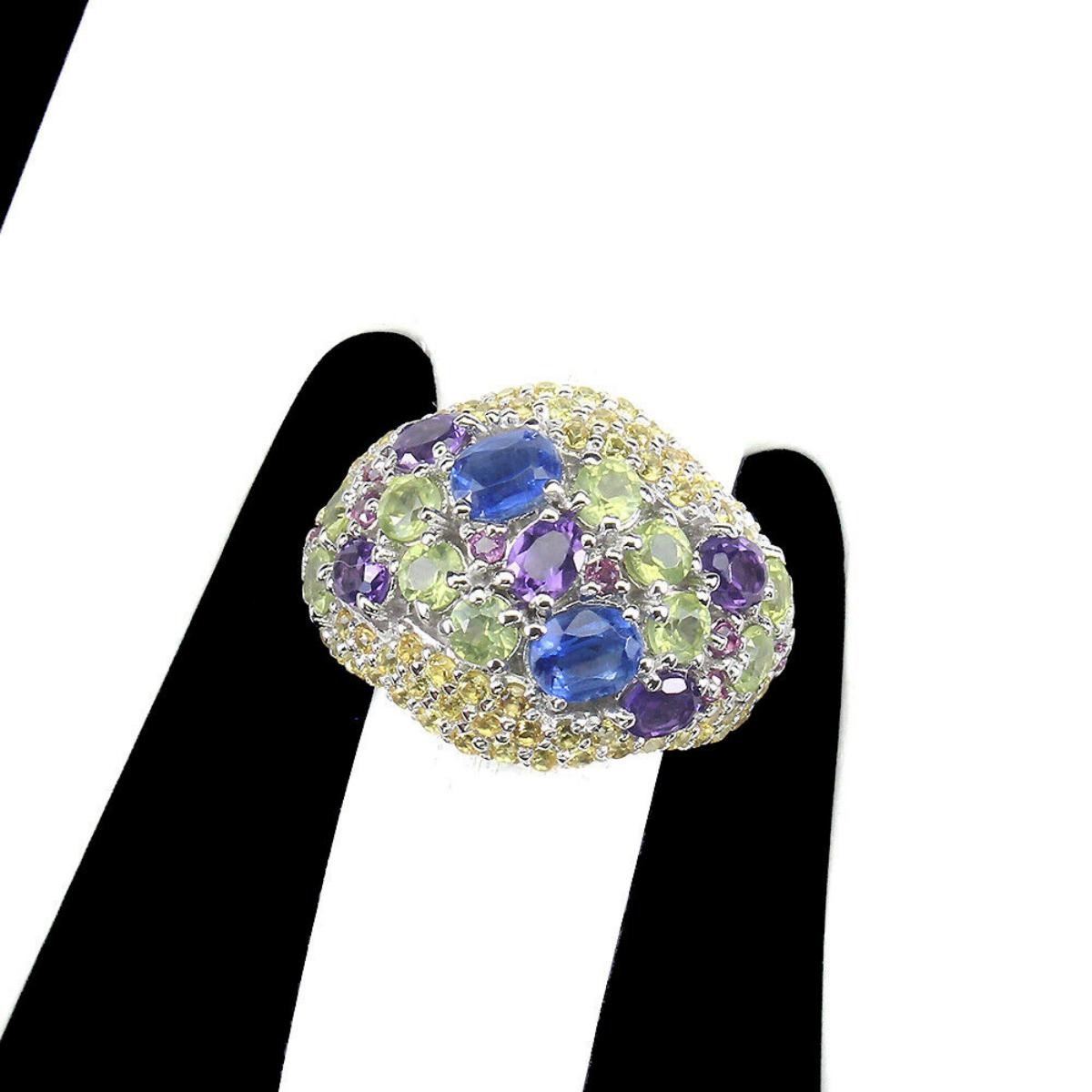 925 STERLING SILVER;PLATE-14K WHITE GOLD;RING SIZE/resizable-7.5MAIN STONE-KYANITE;OTHER GEMS-AMETHYST, PERIDOT, RHODOLITE GARNET, SAPPHIRE;TOTAL WEIGHT-6.83 GRAM (TOTAL WEIGHT OF SILVER + STONE)DIMENSION-* STONE 1.5 TO 5.0 X 4.0 MM. * RING SIZE 7.5 * FACE RING 22.0 X 17.0 MM.;MAIN STONE SHAPE--CORNFLOWER BLUE;CLARITY/GRADE-IF TO VVS;TREATMENT-UNHEATED;ORIGIN-NEPAL;HARDNESS-5.0 - 7.0;