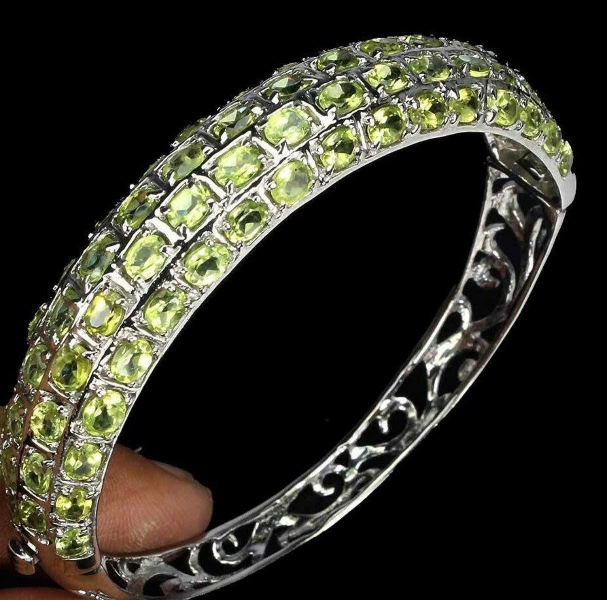 925 STERLING SILVER;PLATE14K WHITE GOLD;LENGTH (INCHES)2.2;MAIN STONEPERIDOT;TOTAL WEIGHT24.89 GRAM (TOTAL WEIGHT OF SILVER + STONE)DIMENSION* STONE 4.0 X 3.0 MM. * DIAMETER 2.3 X 2.2 INCHES. * FACE BANGLE 62.0 X 12.0 MM.;MAIN STONE SHAPEOVAL CUT;MAIN STONE COLORTOP RICH GREEN;CLARITY/GRADEIF TO VVS;LUSTERCHARMING;TREATMENTUNHEATED;ORIGINPAKISTAN;HARDNESS6.5 - 7.0;