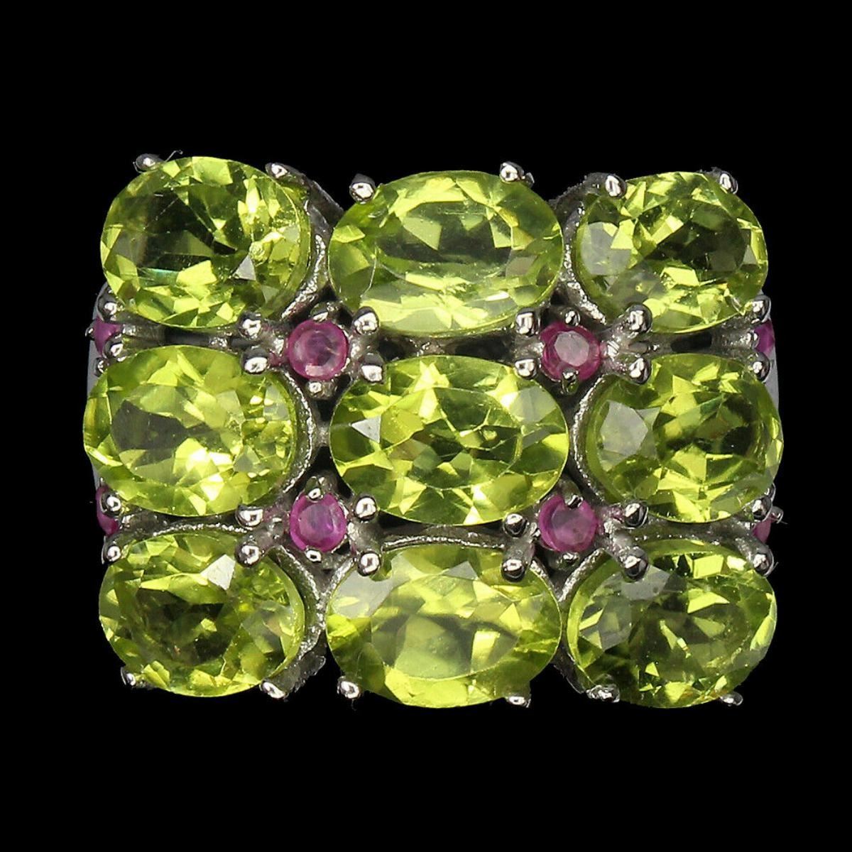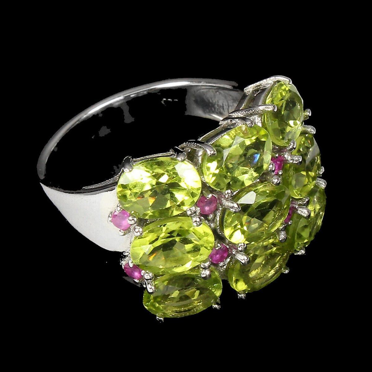 925 STERLING SILVER;PLATE-14K WHITE GOLD;RING SIZE-9(resizeable);MAIN STONE-PERIDOT;OTHER GEMS-RUBY;TOTAL WEIGHT-6.77 GRAM (TOTAL WEIGHT OF SILVER + STONE)DIMENSION-* STONE 1.5 TO 7.0 X 5.0 MM. * RING SIZE 9.0 * FACE RING- 21.0 X 16.0 MM.;MAIN STONE SHAPE-OVAL CUT;MAIN STONE COLOR-TOP RICH GREEN;CLARITY/GRADE-IF TO VVS;TREATMENT-UNHEATED;ORIGIN-PAKISTAN;HARDNESS-6.5 - 7.0;