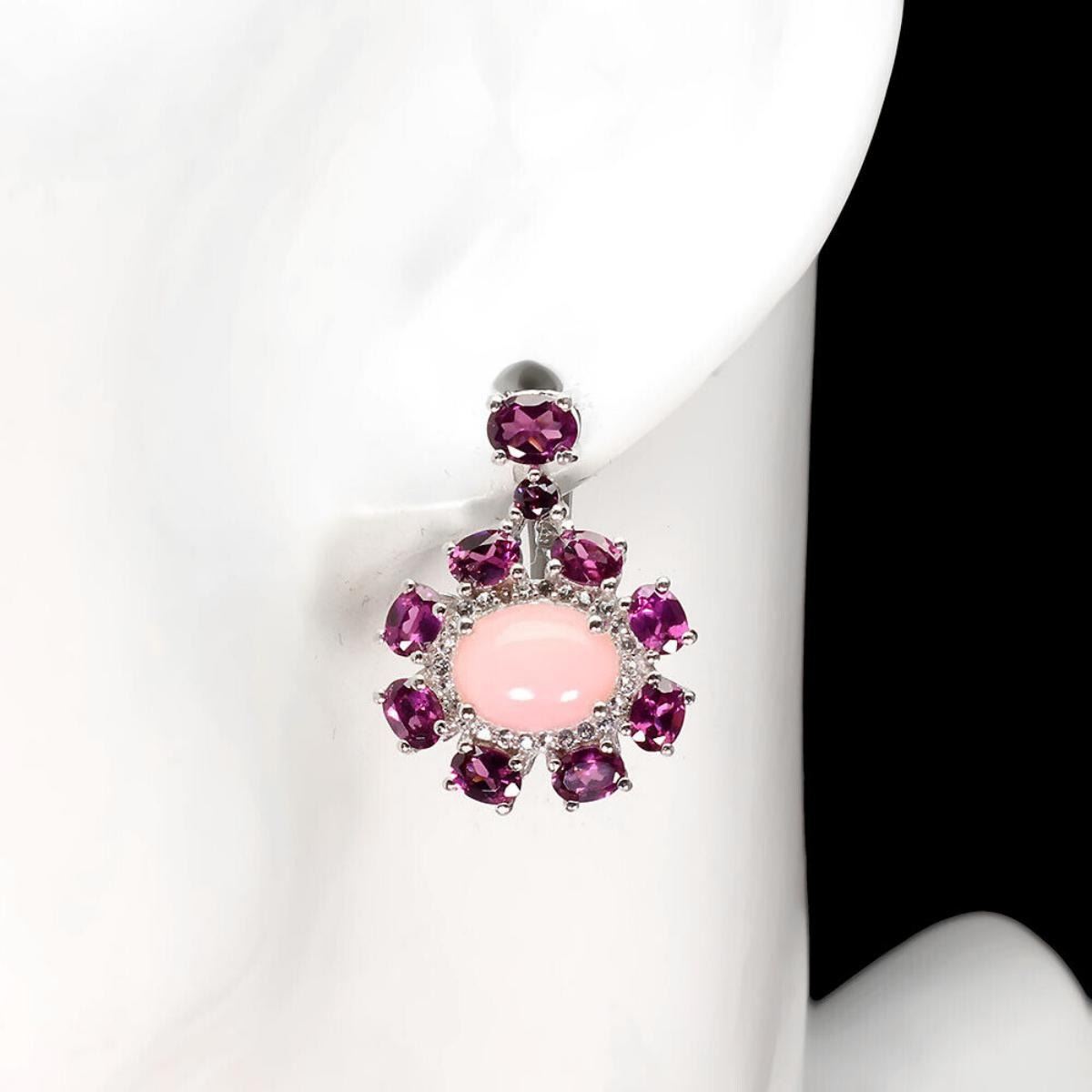 925 STERLING SILVER;PLATE-14K WHITE GOLD;MAIN STONE-PINK OPAL;OTHER GEMS-RHODOLITE GARNET, WHITE TOPAZ;TOTAL WEIGHT-8.16 GRAM (TOTAL WEIGHT OF SILVER + STONE)DIMENSION-* STONE 1.0 TO 9.0 X 7.0 MM.;* FACE EARRINGS -24.0 X 18.0 MM.;MAIN STONE SHAPE-OVAL CABOCHON;MAIN STONE COLOR-TOP NICE PINK;TREATMENT-UNHEATED;ORIGIN--ETHIOPIA;HARDNESS5.5 - 6.5;
