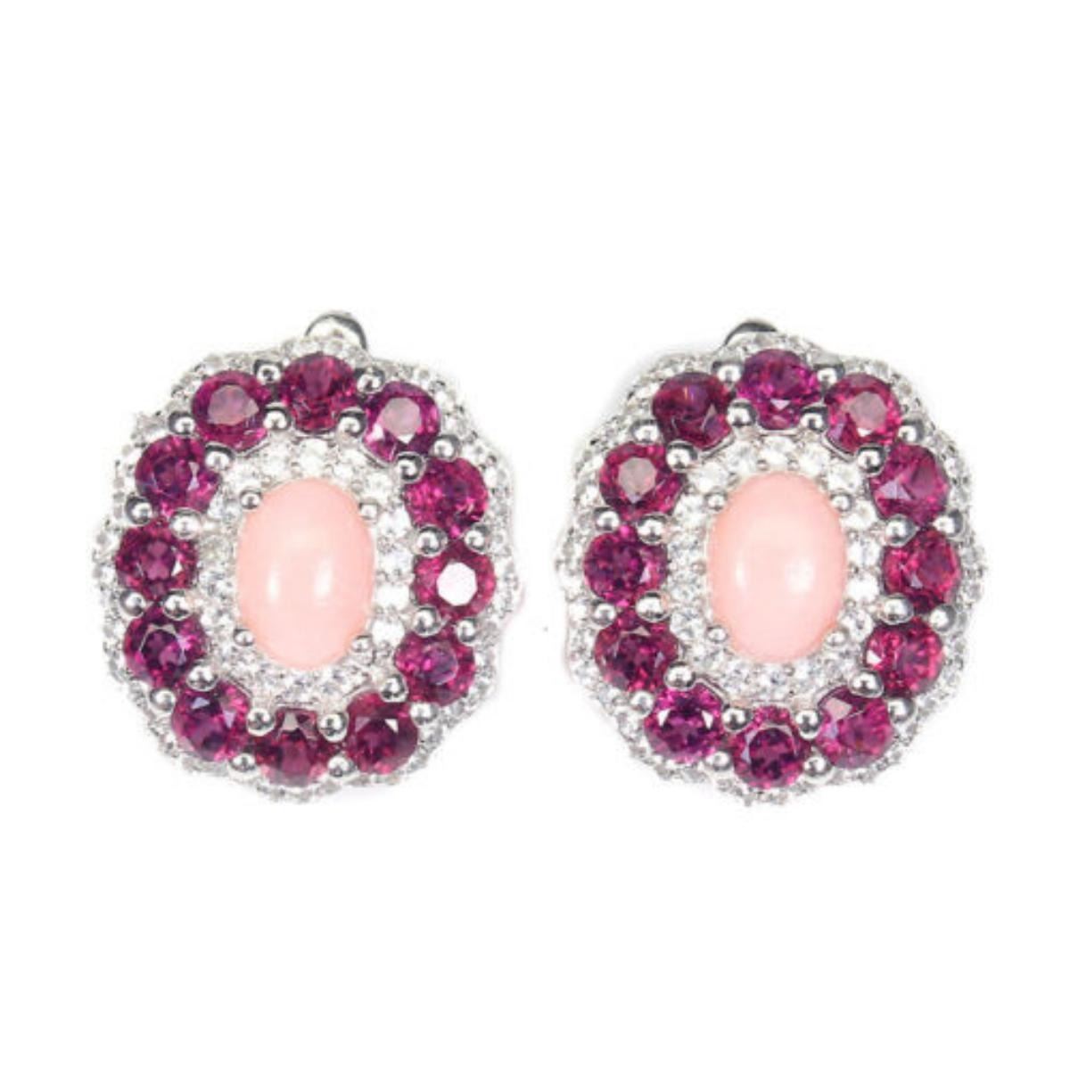 925 STERLING SILVER;PLATE-14K WHITE GOLD;MAIN STONE-PINK OPAL;OTHER GEMS-RHODOLITE GARNET, WHITE TOPAZ;TOTAL WEIGHT-6.7 GRAM (TOTAL WEIGHT OF SILVER + STONE)DIMENSION-* STONE 1.0 TO 7.0 X 5.0 MM.;* FACE EARRINGS- 17.0 X 16.0 MM.;MAIN STONE SHAPE-OVAL CABOCHON;MAIN STONE COLOR-TOP NICE PINK;TREATMENT-UNHEATED;ORIGIN-ETHIOPIA;HARDNESS-5.5 - 6.5;