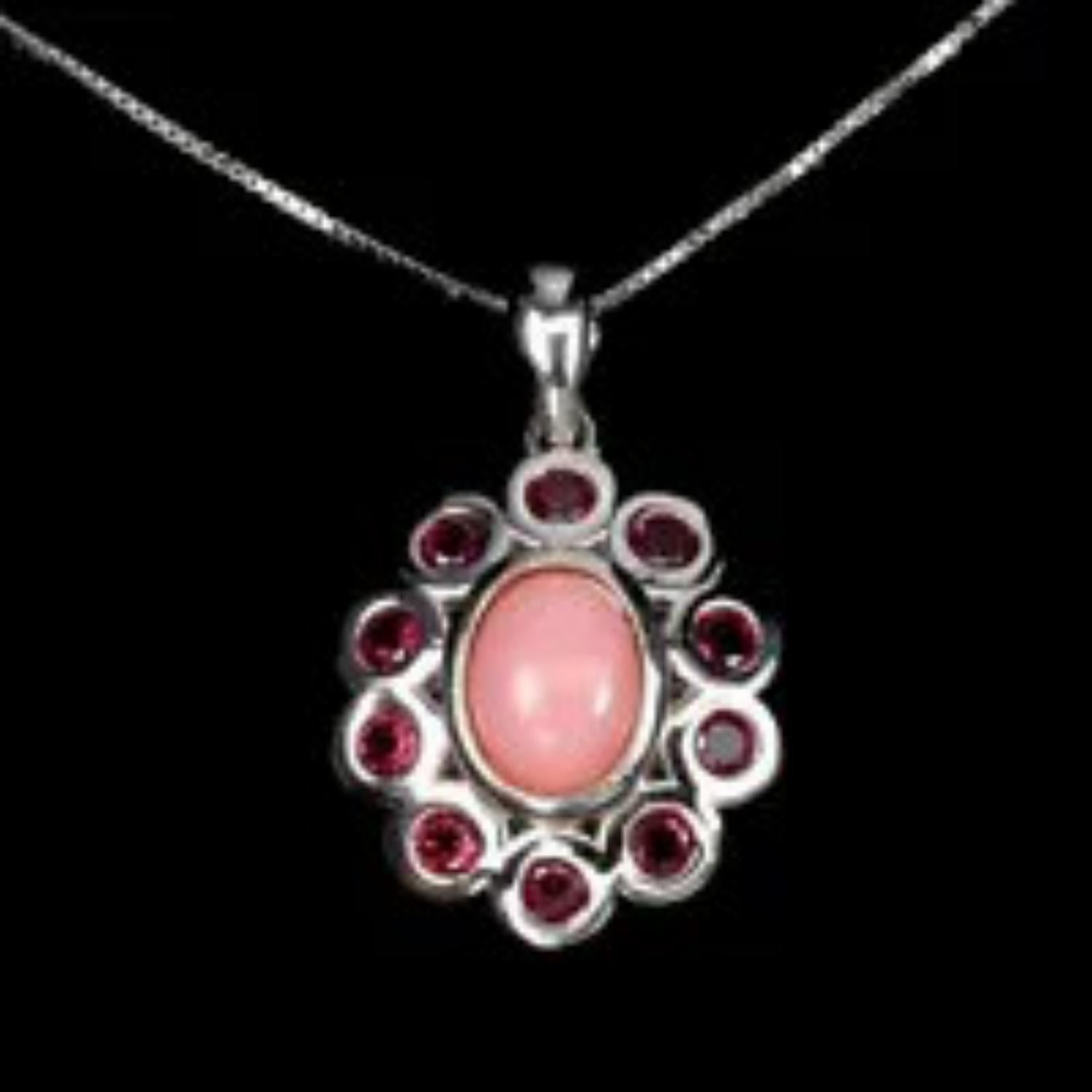 925 STERLING SILVER;PLATE-14K WHITE GOLD;LENGTH (INCHES)18;MAIN STONE-PINK OPAL;OTHER GEMS-RHODOLITE GARNET,;MAIN STONE SHAPE-OVAL CABOCHONMAIN STONE COLOR-PINK;TREATMENT-UNHEATED;ORIGIN-ETHIOPIA;HARDNESS-5.5 - 6.5;