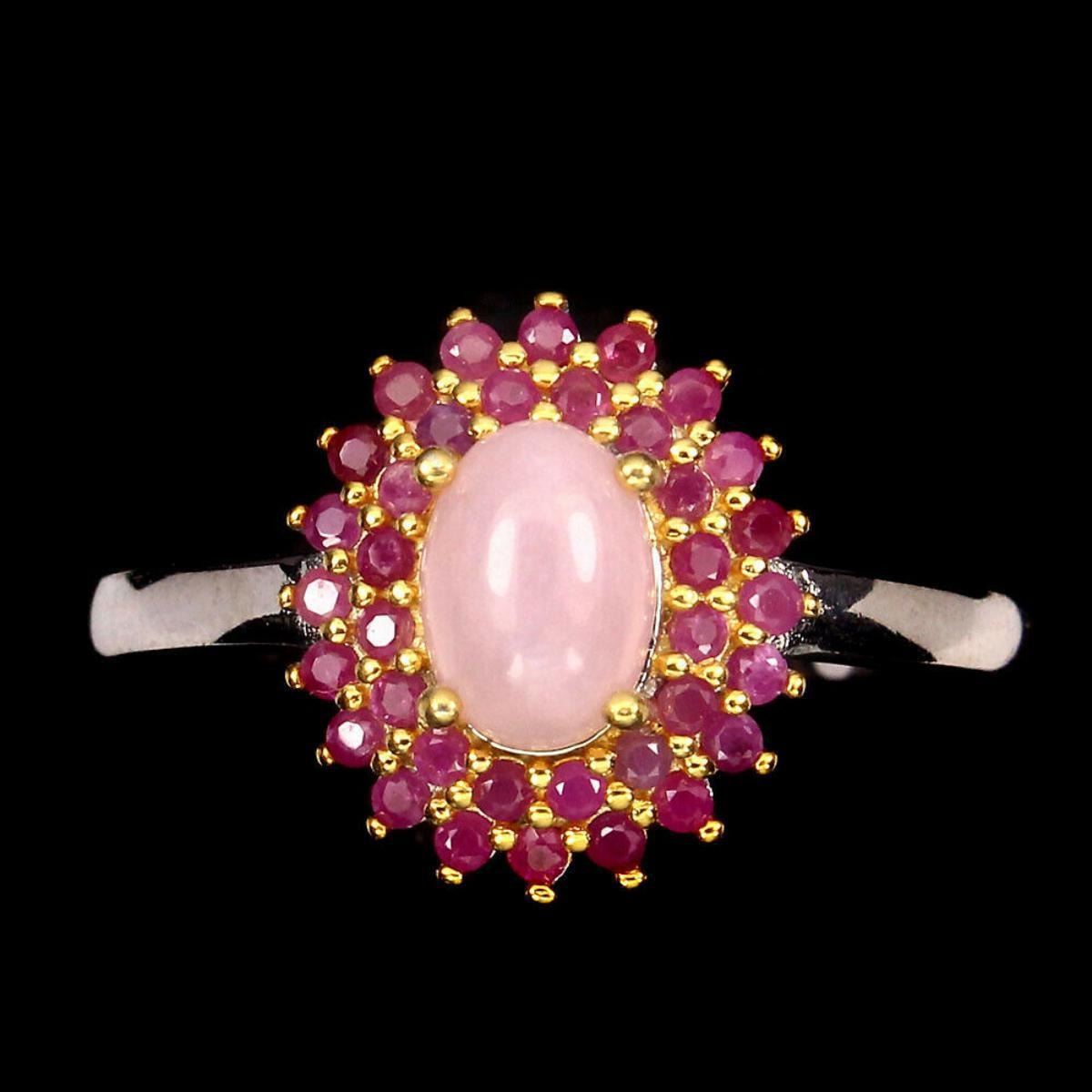 925 STERLING SILVER;PLATE-2-TONE WHITE & YELLOW 14K GOLD;RING SIZE-6(resizeable)MAIN STONE-PINK OPAL;OTHER GEMS-RUBY;TOTAL WEIGHT-16.01 CT (TOTAL WEIGHT OF SILVER + STONE)DIMENSION* STONE 1.0 TO 7.0 X 5.0 MM. * RING SIZE 6.0 * FACE RING 14.0 X 12.0 MM.;MAIN STONE SHAPE-OVAL CABOCHON;MAIN STONE COLOR-TOP NICE PINK;TREATMENT-UNHEATED;ORIGIN-BRAZIL;HARDNESS-5.5 - 6.5;