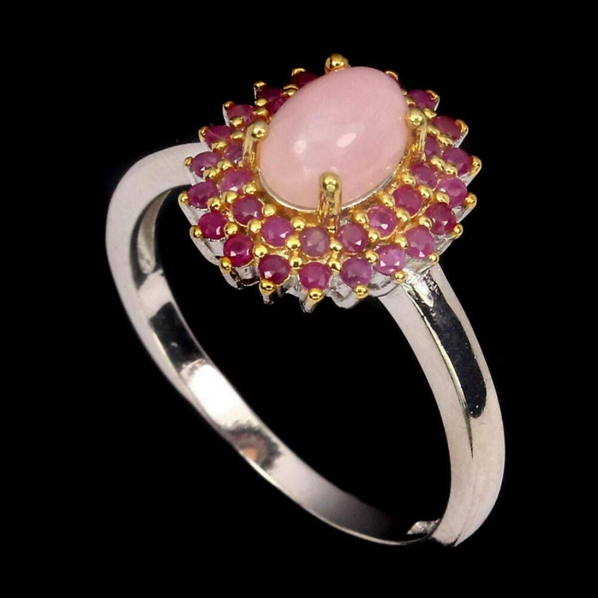 925 STERLING SILVER;PLATE-2-TONE WHITE & YELLOW 14K GOLD;RING SIZE-6(resizeable)MAIN STONE-PINK OPAL;OTHER GEMS-RUBY;TOTAL WEIGHT-16.01 CT (TOTAL WEIGHT OF SILVER + STONE)DIMENSION* STONE 1.0 TO 7.0 X 5.0 MM. * RING SIZE 6.0 * FACE RING 14.0 X 12.0 MM.;MAIN STONE SHAPE-OVAL CABOCHON;MAIN STONE COLOR-TOP NICE PINK;TREATMENT-UNHEATED;ORIGIN-BRAZIL;HARDNESS-5.5 - 6.5;