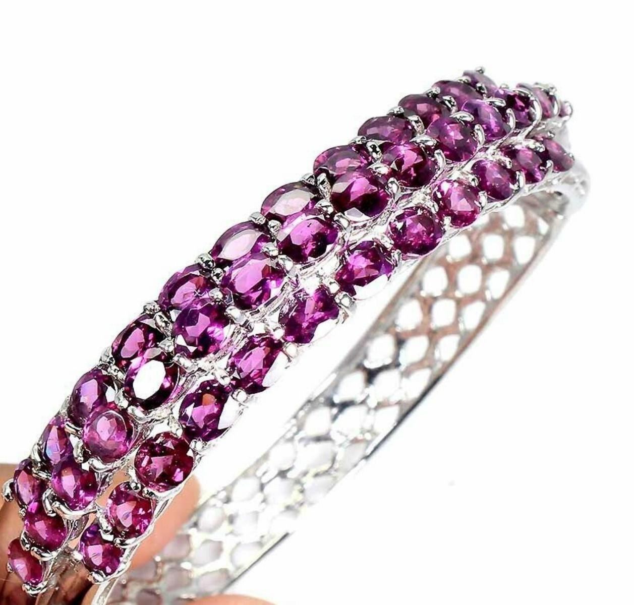 925 STERLING SILVER;PLATE-14K WHITE GOLD;MAIN STONE-RHODOLITE GARNET;TOTAL WEIGHT-27.96 GRAM (TOTAL WEIGHT OF SILVER + STONE)DIMENSION-* STONE 5.0 X 4.0 MM. * DIAMETER 2.4 X 2.4 INCHES. * FACE BANGLE- 62.0 X 11.0 MM.;MAIN STONE SHAPE-OVAL CUT;MAIN STONE COLOR-TOP RICH PINK RASPBERRY;CLARITY/GRADE-IF TO VVS;TREATMENT-UNHEATED;ORIGIN-AFRICA;HARDNESS-7.0 - 7.5;