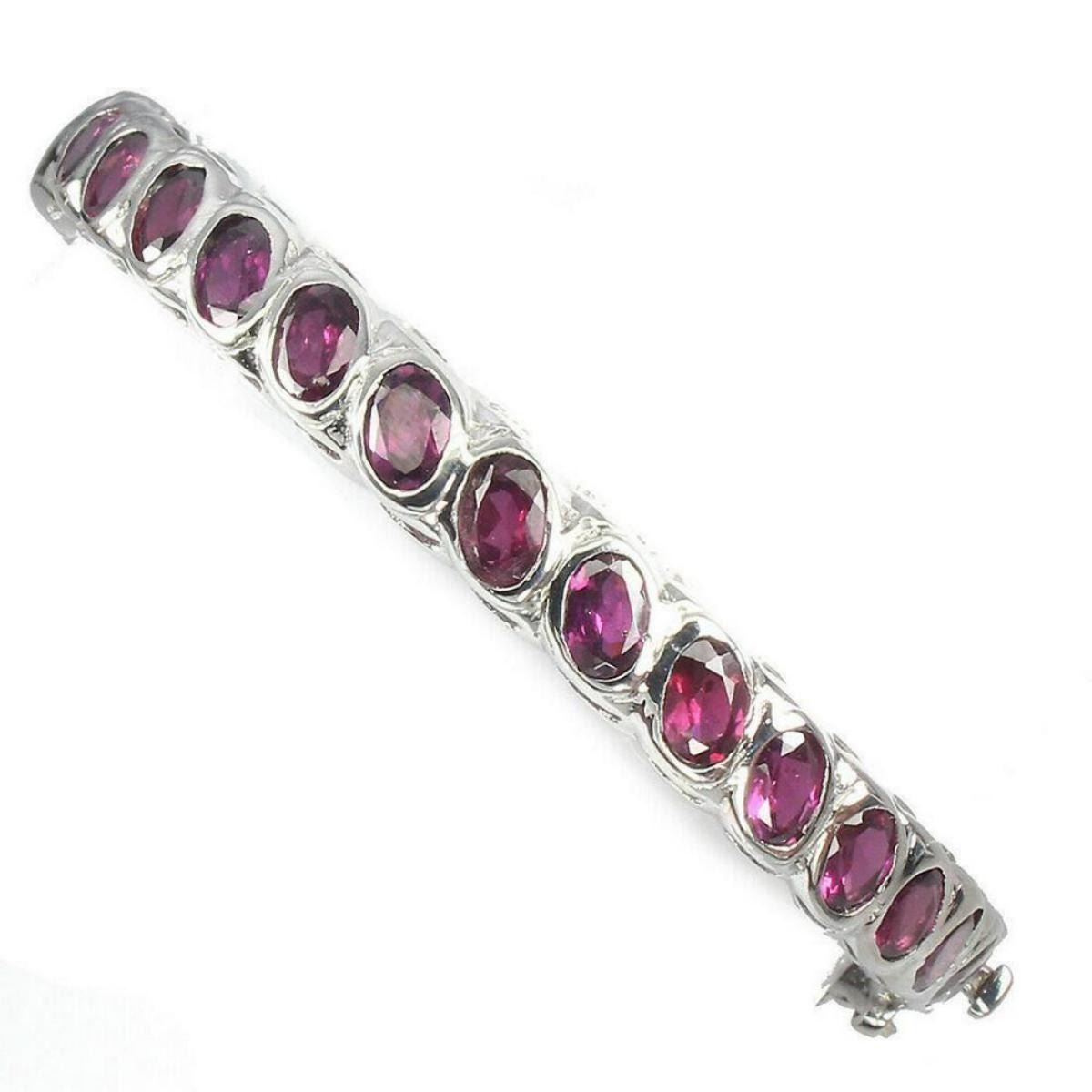 925 STERLING SILVER;PLATE-14K WHITE GOLD;-MAIN STONE-RHODOLITE GARNET;TOTAL WEIGHT-21.09 CT (TOTAL WEIGHT OF SILVER + STONE)DIMENSION-* STONE 6.0 X 4.0 MM. * DIAMETER 2.1 X 2.1 INCHES. * FACE BANGLE- 64.0 X 7.0 MM.;MAIN STONE SHAPE-OVAL CUT;;MAIN STONE COLOR-TOP RICH PINK RASPBERRY;CLARITY/GRADE-IF TO VVS;;TREATMENT-UNHEATED;ORIGIN-AFRICA;HARDNESS-7.0 - 7.5;