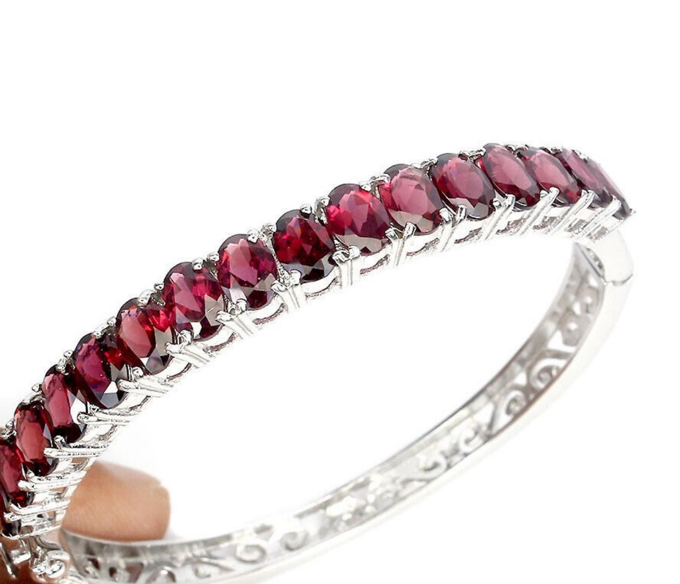 925 STERLING SILVER;PLATE-14K WHITE GOLD;MAIN STONE-RHODOLITE GARNET;TOTAL WEIGHT-17.58 GRAM (TOTAL WEIGHT OF SILVER + STONE)DIMENSION-* STONE 7.0 X 5.0 MM.;* DIAMETER -2.0 X 2.0 INCHES.;* FACE BANGLE -63.0 X 7.0 MM.;MAIN STONE SHAPE-OVAL CUT;MAIN STONE COLOR-PINK RASPBERRY;CLARITY/GRADE-IF TO VVS;TREATMENT-UNHEATED;;ORIGIN-AFRICA;HARDNESS-7.0 - 7.5;