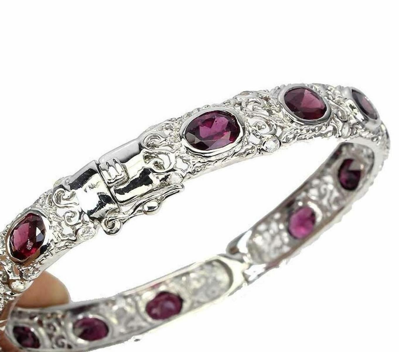 925 STERLING SILVER;PLATE-14K WHITE GOLD;LENGTH (INCHES)2.3;MAIN STONE-RHODOLITE GARNET;OTHER GEMS-WHITE TOPAZ;TOTAL WEIGHT-18.78 GRAM (TOTAL WEIGHT OF SILVER + STONE)DIMENSION-* STONE 2.0 TO 7.0 X 5.0 MM.;* DIAMETER- 2.3 X 2.2 INCHES.;* FACE BANGLE- 63.0 X 9.0 MM.;MAIN STONE SHAPE-OVAL CUT;MAIN STONE COLOR- PINK RASPBERRY;CLARITY/GRADE-IF TO VVS;TREATMENT-UNHEATED;ORIGIN-AFRICA;HARDNESS-7.0 - 7.5;