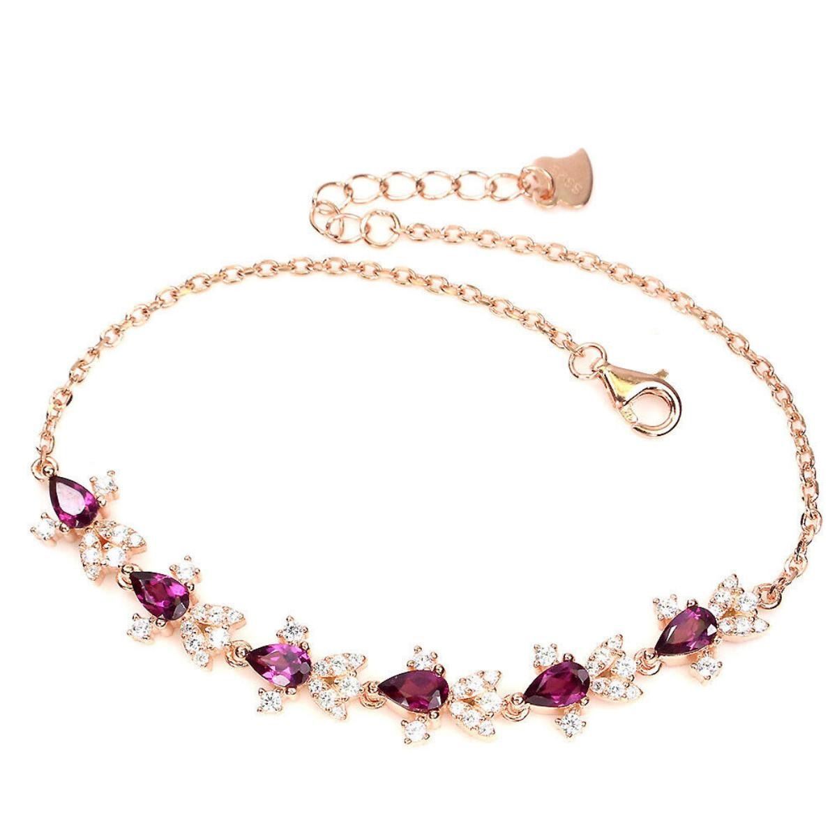 925 STERLING SILVER;PLATE-14K ROSE GOLD;LENGTH (INCHES)7;MAIN STONE-RHODOLITE GARNET;TOTAL WEIGHT-4.5 GRAM (TOTAL WEIGHT OF SILVER + STONE)DIMENSION-* STONE 5.0 X 3.0 MM. * CZ 1.0 TO 1.5 MM.* LENGTH 7.0 INCHES.* FACE BRACELET 61.0 X 8.0 MM.;MAIN STONE SHAPE-PEAR CUT;MAIN STONE COLOR- PINK RASPBERRY;CLARITY/GRADE-IF TO VVS;TREATMENT-UNHEATED;ORIGIN-AFRICA;HARDNESS-7;