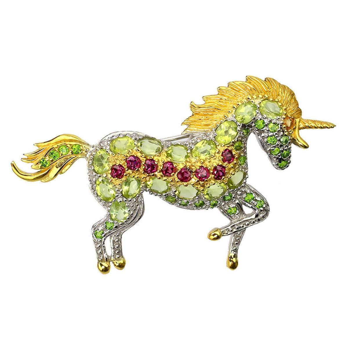 925 STERLING SILVER;PLATE-2-TONE WHITE & YELLOW 14K GOLD;MAIN STONE-PERIDOT;OTHER GEMS-CHROME DIOPSIDE, RHODOLITE GARNET, SAPPHIRE;TOTAL WEIGHT-7.83 GRAM (TOTAL WEIGHT OF SILVER + STONE);DIMENSION- * STONE 1.5 TO 4.0 X 3.0 MM.* FACE BROOCH 54.0 X 33.0 MM.;MAIN STONE SHAPE-OVAL CUT;MAIN STONE COLOR- GREEN;CLARITY/GRADE-IF TO VVS;TREATMENT-UNHEATED;ORIGIN-PAKISTAN;