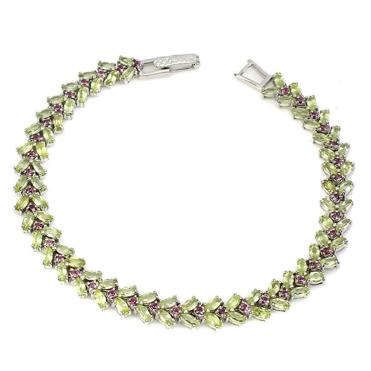925 STERLING SILVER;PLATE-14K WHITE GOLD;LENGTH (INCHES)- 8;MAIN STONE-PERIDOT;OTHER GEMS-RHODOLITE GARNET;TOTAL WEIGHT-13.62 GRAM (TOTAL WEIGHT OF SILVER + STONE);DIMENSION-* STONE 2.0 TO 4.0 X 2.0 MM. * LENGTH 8.0 INCHES.* FACE BRACELET 195.0 X 7.0 MM.;MAIN STONE SHAPE-MARQUISE CUT;MAIN STONE COLOR- GREEN;CLARITY/GRADE-IF TO VVS;TREATMENT-UNHEATED;ORIGIN-PAKISTAN;HARDNESS-6;