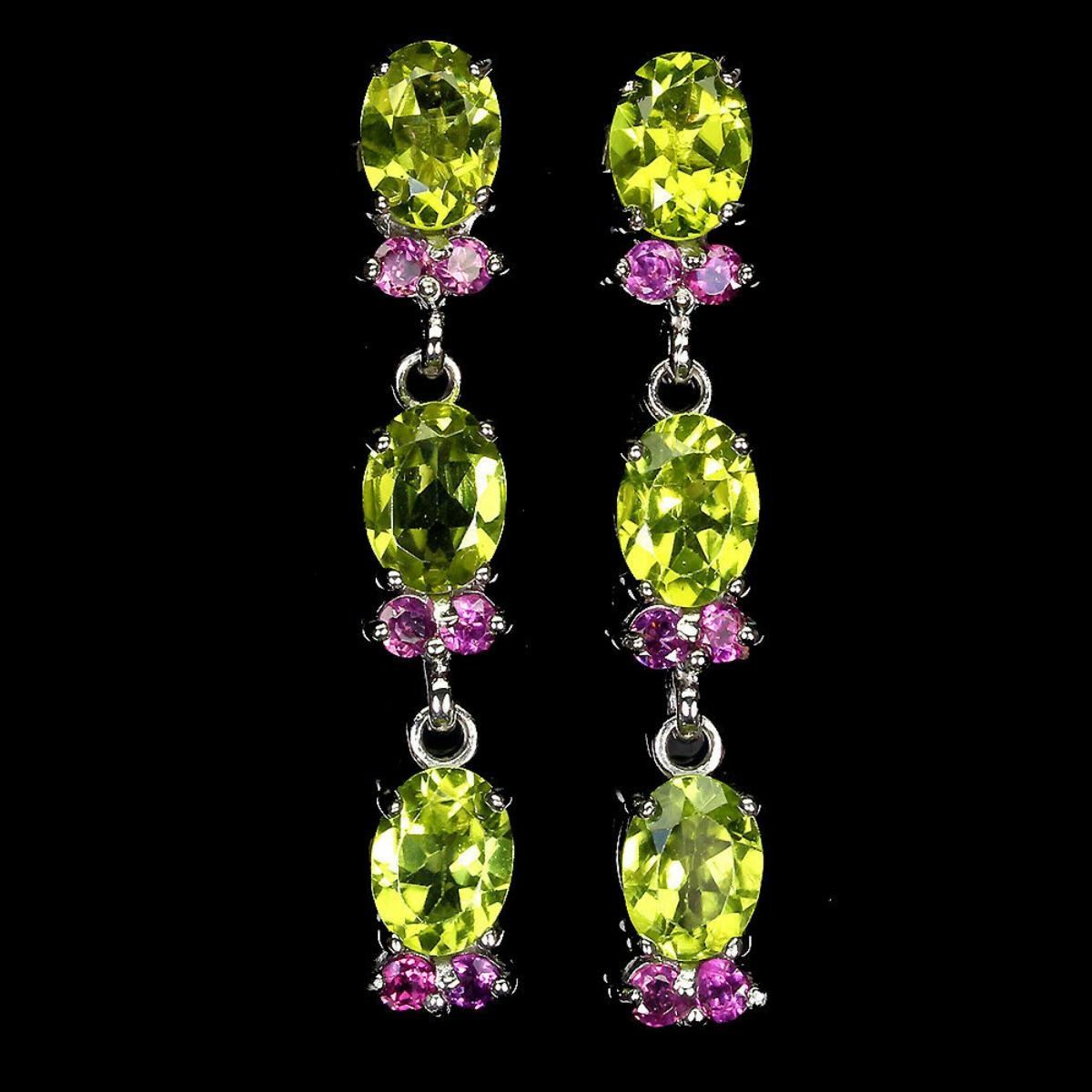 925 STERLING SILVER;PLATE-14K WHITE GOLD;MAIN STONE-PERIDOT;OTHER GEMS-RHODOLITE GARNET;TOTAL WEIGHT-5.93 GRAM (TOTAL WEIGHT OF SILVER + STONE);DIMENSION-* STONE 2.5 TO 8.0 X 6.0 MM. * FACE EARRINGS 39.0 X 6.0 MM.;MAIN STONE SHAPE-OVAL CUT;MAIN STONE COLOR- GREEN;CLARITY/GRADE-IF TO VVS;TREATMENT-UNHEATED;ORIGIN-PAKISTAN;HARDNESS-6.5 - 7.0;