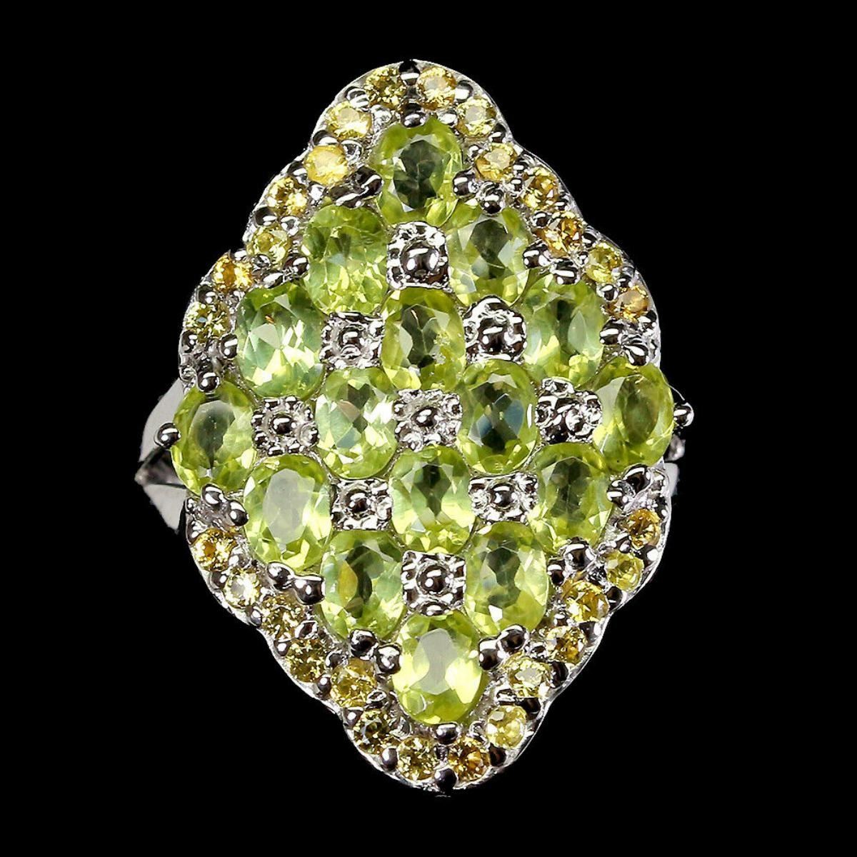925 STERLING SILVER;PLATE-14K WHITE GOLD;RING SIZE-8(RESIZABLE);MAIN STONE-PERIDOT;OTHER GEMS-SAPPHIRE DIAMOND CUT;TOTAL WEIGHT-5.78 GRAM (TOTAL WEIGHT OF SILVER + STONE);DIMENSION-* STONE 1.5 TO 4.0 X 3.0 MM. * RING SIZE 8.0 * FACE RING 25.0 X 18.0 MM.;MAIN STONE SHAPE-OVAL CUT;MAIN STONE COLOR- GREEN;CLARITY/GRADE-IF;TREATMENT-UNHEATED;ORIGIN-PAKISTAN;HARDNESS-6.5 - 7.0;