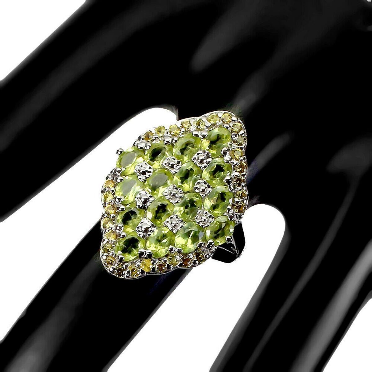 925 STERLING SILVER;PLATE-14K WHITE GOLD;RING SIZE-8(RESIZABLE);MAIN STONE-PERIDOT;OTHER GEMS-SAPPHIRE DIAMOND CUT;TOTAL WEIGHT-5.78 GRAM (TOTAL WEIGHT OF SILVER + STONE);DIMENSION-* STONE 1.5 TO 4.0 X 3.0 MM. * RING SIZE 8.0 * FACE RING 25.0 X 18.0 MM.;MAIN STONE SHAPE-OVAL CUT;MAIN STONE COLOR- GREEN;CLARITY/GRADE-IF;TREATMENT-UNHEATED;ORIGIN-PAKISTAN;HARDNESS-6.5 - 7.0;