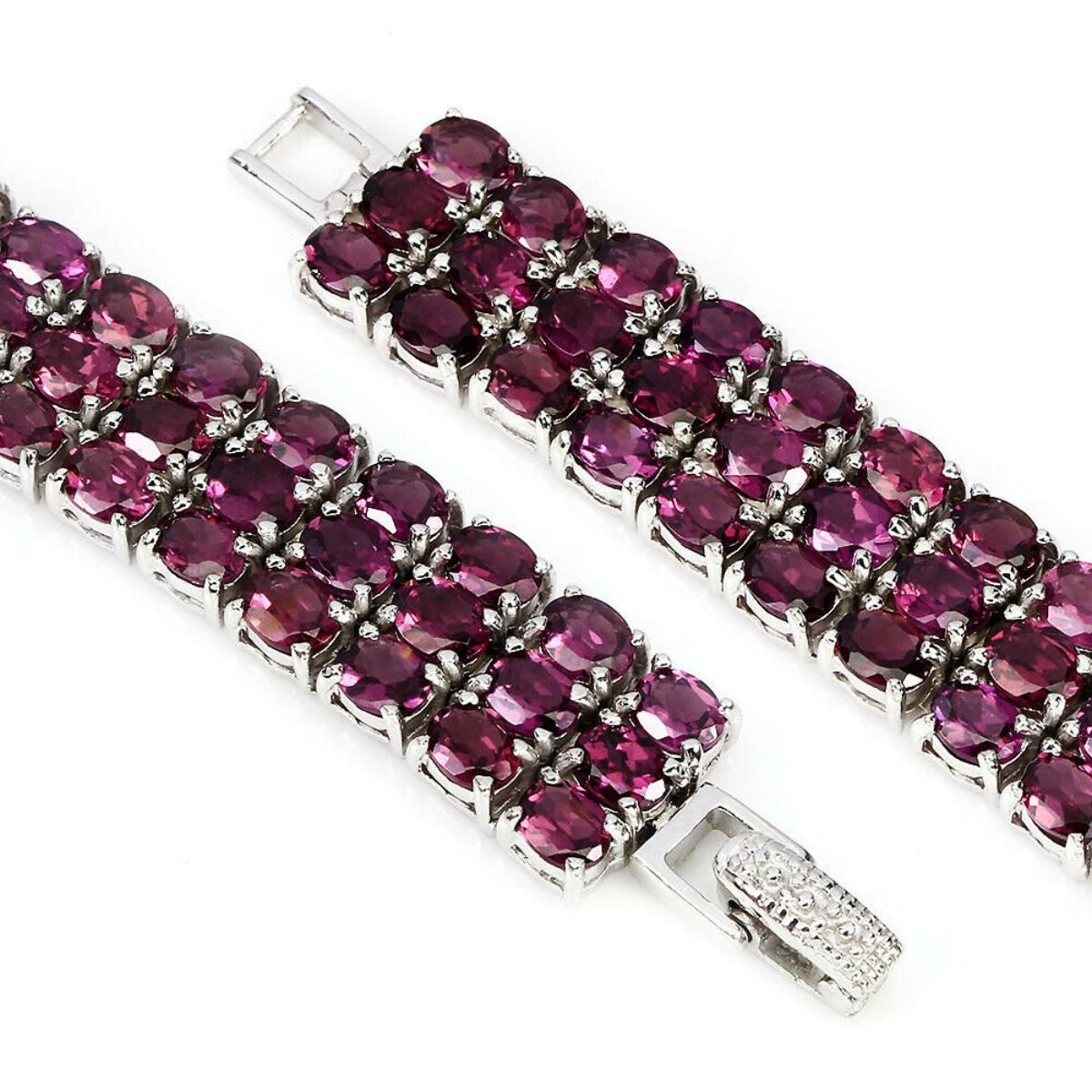 BRACELET..........TYPE OF METAL-925 STERLING SILVER.PLATE-14K WHITE GOLD.;LENGTH (INCHES)-7.5.;MAIN STONE-RHODOLITE GARNET;TOTAL WEIGHT-33.04 GRAM (TOTAL WEIGHT OF SILVER + STONE)DIMENSION-* STONE 5.0 X 3.0 MM. * TOTAL LENGTH 7.5 INCHES. * FACE BRACELET -165.0 X 12.0 MM.;MAIN STONE SHAPE-OVAL CUT;MAIN STONE COLOR-TOP RICH PINK RASPBERRY;CLARITY/GRADE-IF TO VVS;TREATMENT-UNHEATED;ORIGIN-AFRICA;