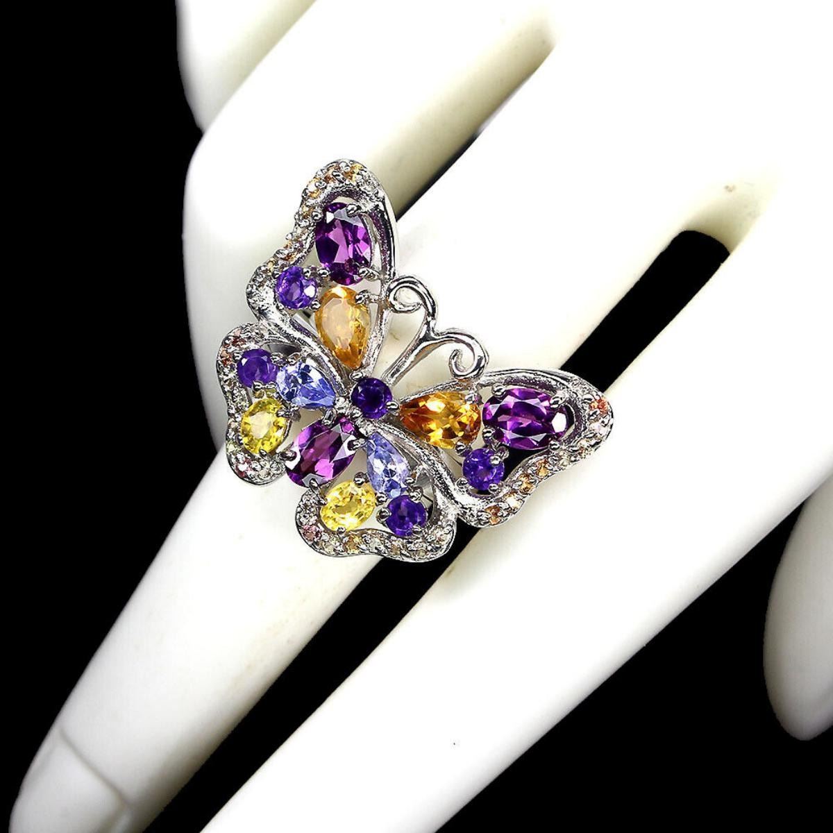 925 STERLING SILVER;PLATE-14K WHITE GOLD;RING SIZE-7.5(RESIZABLE);MAIN STONE-RHODOLITE GARNET;OTHER GEMS-AMETHYST, CITRINE, SAPPHIRE, TANZANITE;TOTAL WEIGHT-7.83 GRAM (TOTAL WEIGHT OF SILVER + STONE);DIMENSION-* STONE 1.0 TO 6.0 X 4.0 MM.* RING SIZE 7.5* FACE RING 28.0 X 22.0 MM.;MAIN STONE SHAPE-OVAL CUT;MAIN STONE COLOR- PINK RASPBERRY;CLARITY/GRADE-IF TO VVS;TREATMENT-UNHEATED;ORIGIN-AFRICA;