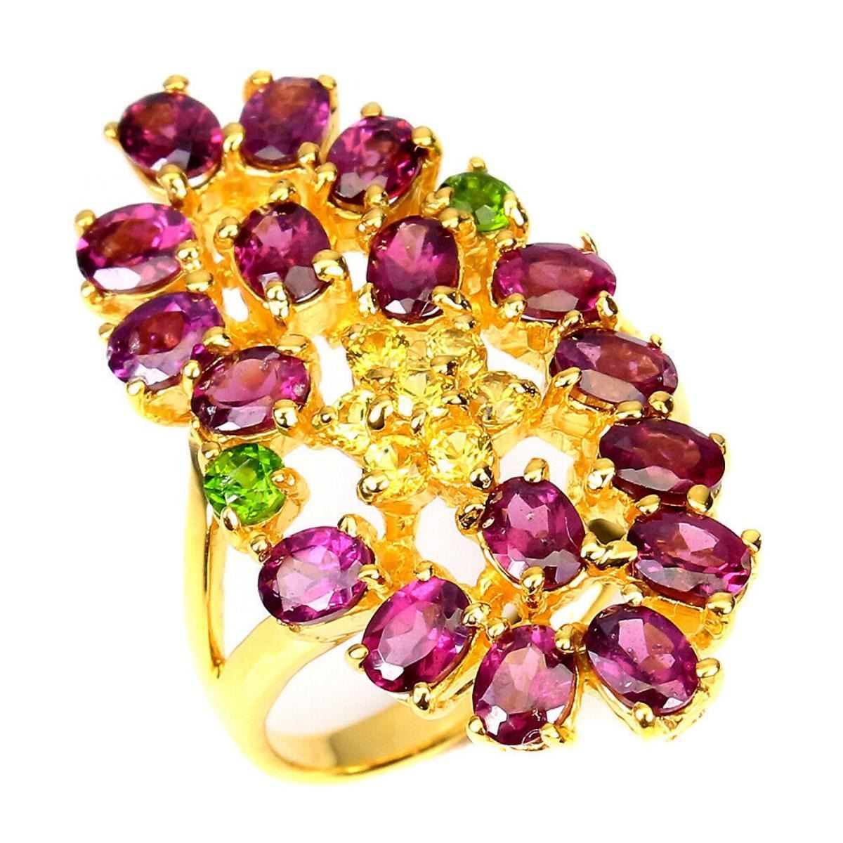 925 STERLING SILVER;PLATE-14K YELLOW GOLD;RING SIZE(INCHES)-7(RESIZABLE);MAIN STONE-RHODOLITE GARNET;OTHER GEMS-CHROME DIOPSIDE, SAPPHIRE;TOTAL WEIGHT-6.67 GRAM (TOTAL WEIGHT OF SILVER + STONE);DIMENSION-* STONE 2.0 TO 4.0 X 3.0 MM. * RING SIZE 7.0 * FACE RING 30.0 X 17.0 MM.;MAIN STONE SHAPE-OVAL ;MAIN STONE COLOR-PINK RASPBERRY;CLARITY/GRADE-IF TO VVS;TREATMENT-UNHEATED;ORIGIN-AFRICA;HARDNESS-7;
