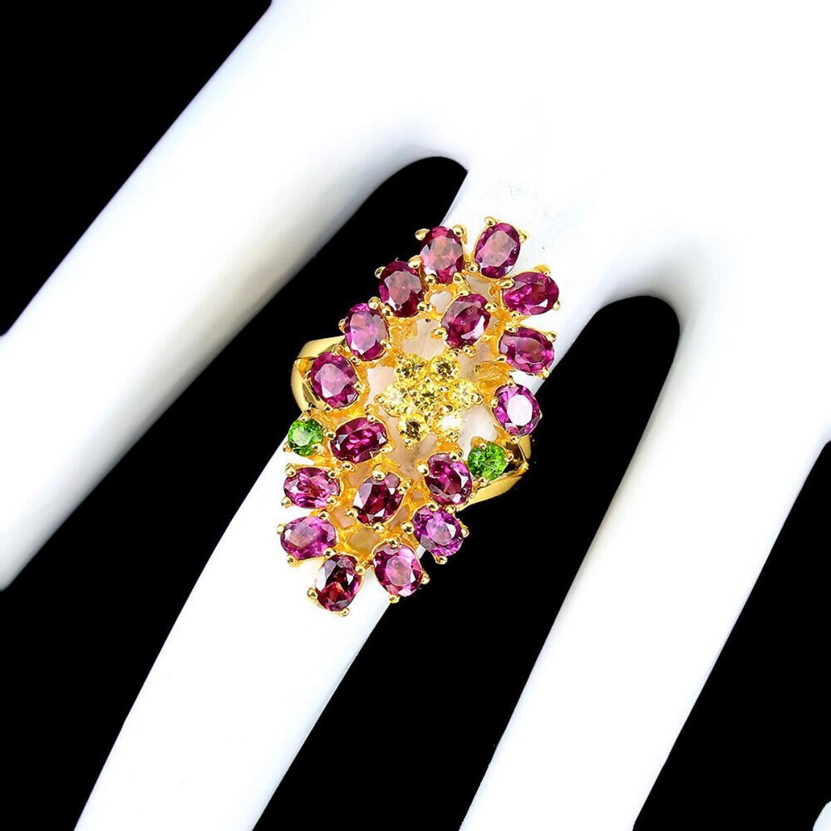 925 STERLING SILVER;PLATE-14K YELLOW GOLD;RING SIZE(INCHES)-7(RESIZABLE);MAIN STONE-RHODOLITE GARNET;OTHER GEMS-CHROME DIOPSIDE, SAPPHIRE;TOTAL WEIGHT-6.67 GRAM (TOTAL WEIGHT OF SILVER + STONE);DIMENSION-* STONE 2.0 TO 4.0 X 3.0 MM. * RING SIZE 7.0 * FACE RING 30.0 X 17.0 MM.;MAIN STONE SHAPE-OVAL ;MAIN STONE COLOR-PINK RASPBERRY;CLARITY/GRADE-IF TO VVS;TREATMENT-UNHEATED;ORIGIN-AFRICA;HARDNESS-7;