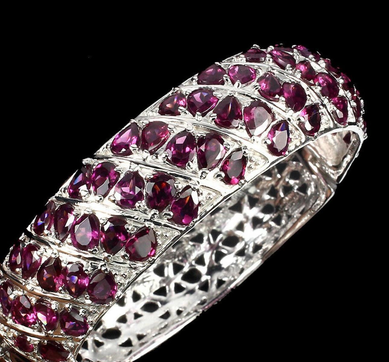 925 STERLING SILVER;PLATE-14K WHITE GOLD;LENGTH -2.2(INCHES);MAIN STONE-RHODOLITE GARNET;TOTAL WEIGHT-40.49 GRAM (TOTAL WEIGHT OF SILVER + STONE)DIMENSION* STONE 3.0 TO 5.0 X 4.0 MM. * DIAMETER 2.2 X 2.0 INCHES. * FACE BANGLE 68.0 X 17.0 MM.;MAIN STONE SHAPE-PEAR CUT;MAIN STONE COLOR-TOP RICH PINK RASPBERRY;CLARITY/GRADE-IF TO VVS;;TREATMENT-UNHEATED;ORIGIN-AFRICA;HARDNESS-7.0 - 7.5;