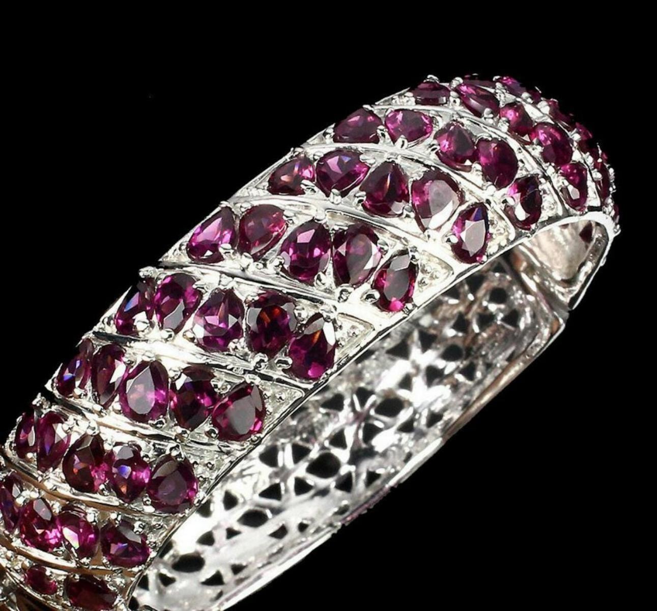 925 STERLING SILVER;PLATE-14K WHITE GOLD;LENGTH -2.2(INCHES);MAIN STONE-RHODOLITE GARNET;TOTAL WEIGHT-40.49 GRAM (TOTAL WEIGHT OF SILVER + STONE)DIMENSION* STONE 3.0 TO 5.0 X 4.0 MM. * DIAMETER 2.2 X 2.0 INCHES. * FACE BANGLE 68.0 X 17.0 MM.;MAIN STONE SHAPE-PEAR CUT;MAIN STONE COLOR-TOP RICH PINK RASPBERRY;CLARITY/GRADE-IF TO VVS;;TREATMENT-UNHEATED;ORIGIN-AFRICA;HARDNESS-7.0 - 7.5;