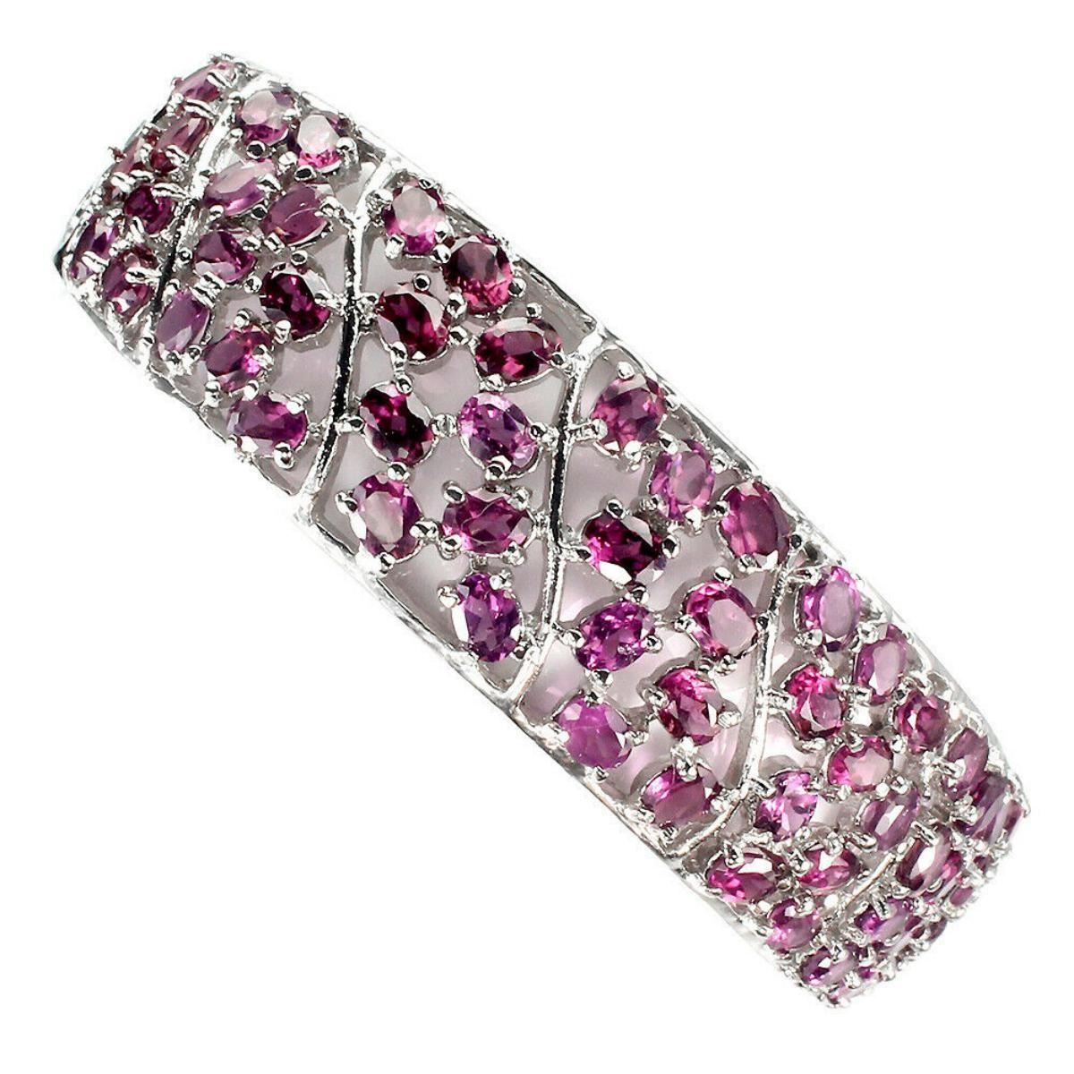 925 STERLING SILVER;PLATE-14K WHITE GOLD;MAIN STONE-RHODOLITE GARNET;TOTAL WEIGHT-21.16 GRAM (TOTAL WEIGHT OF SILVER + STONE)DIMENSION-* STONE 4.0 X 3.0 MM. * DIAMETER 2.2 X 2.2 INCHES. * FACE BANGLE- 64.0 X 17.0 MM.;MAIN STONE SHAPE-OVAL CUT;MAIN STONE COLOR- RICH PINK RASPBERRY;CLARITY/GRADE-IF TO VVS;TREATMENT-UNHEATED;ORIGIN-AFRICA;HARDNESS-7.0 - 7.5;