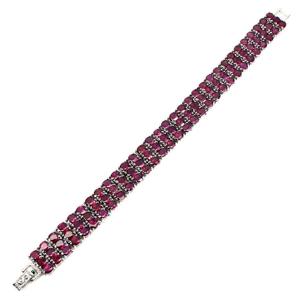 925 STERLING SILVER;PLATE-14K WHITE GOLD;LENGTH (INCHES)-7.5;MAIN STONE-RHODOLITE GARNET;TOTAL WEIGHT-32.84 GRAM (TOTAL WEIGHT OF SILVER + STONE);DIMENSION-* STONE 5.0 X 4.0 MM. * TOTAL LENGTH 7.5 INCHES. *; FACE BRACELET- 170.0 X 12.0 MM.;MAIN STONE SHAPE-OVAL CUT;MAIN STONE COLOR- PINK RASPBERRY;CLARITY/GRADE-IF TO VVS;TREATMENT-UNHEATED;ORIGIN-AFRICA;HARDNESS-7.0 - 7.5;