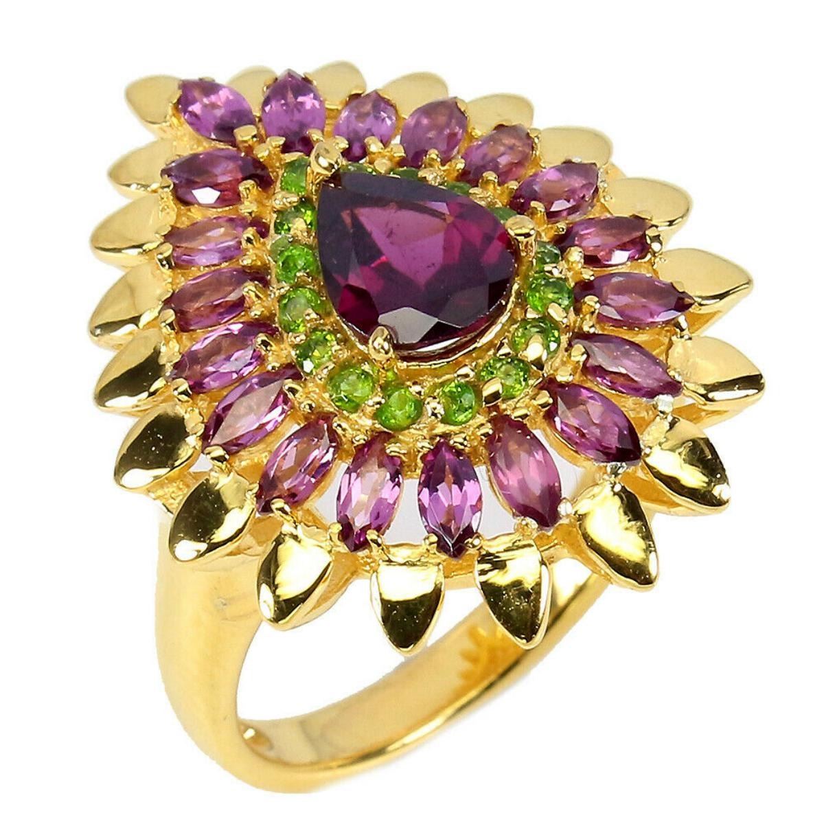 925 STERLING SILVER;PLATE-14K YELLOW GOLD;RING SIZE-8;MAIN STONE-RHODOLITE GARNET;OTHER GEMS-CHROME DIOPSIDE;TOTAL WEIGHT-7.3 GRAM (TOTAL WEIGHT OF SILVER + STONE);DIMENSION-* STONE 1.5 TO 8.0 X 6.0 MM. * RING SIZE 8.0 * FACE RING 27.0 X 21.0 MM.;MAIN STONE SHAPE-OVAL CUT;MAIN STONE COLOR-PINK RASPBERRY;CLARITY/GRADE-IF TO VVS;TREATMENT-UNHEATED;ORIGIN-AFRICA;HARDNESS-7;