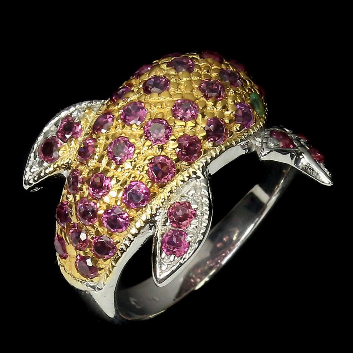925 STERLING SILVER;PLATE-2-TONE WHITE & YELLOW 14K GOLD;RING SIZE-7(RESIZABLE);MAIN STONE-RHODOLITE GARNET;OTHER GEMS-EMERALD;TOTAL WEIGHT-5.35 GRAM (TOTAL WEIGHT OF SILVER + STONE);DIMENSION-* STONE 2.0 MM.* RING SIZE 7.0* FACE RING 21.0 X 11.0 MM;MAIN STONE SHAPE- ROUND CUT;MAIN STONE COLOR- PINK RASPBERRY;CLARITY/GRADE-IF;TREATMENT- UNHEATED;ORIGIN-AFRICA;HARDNESS- 7.0 - 7.5;