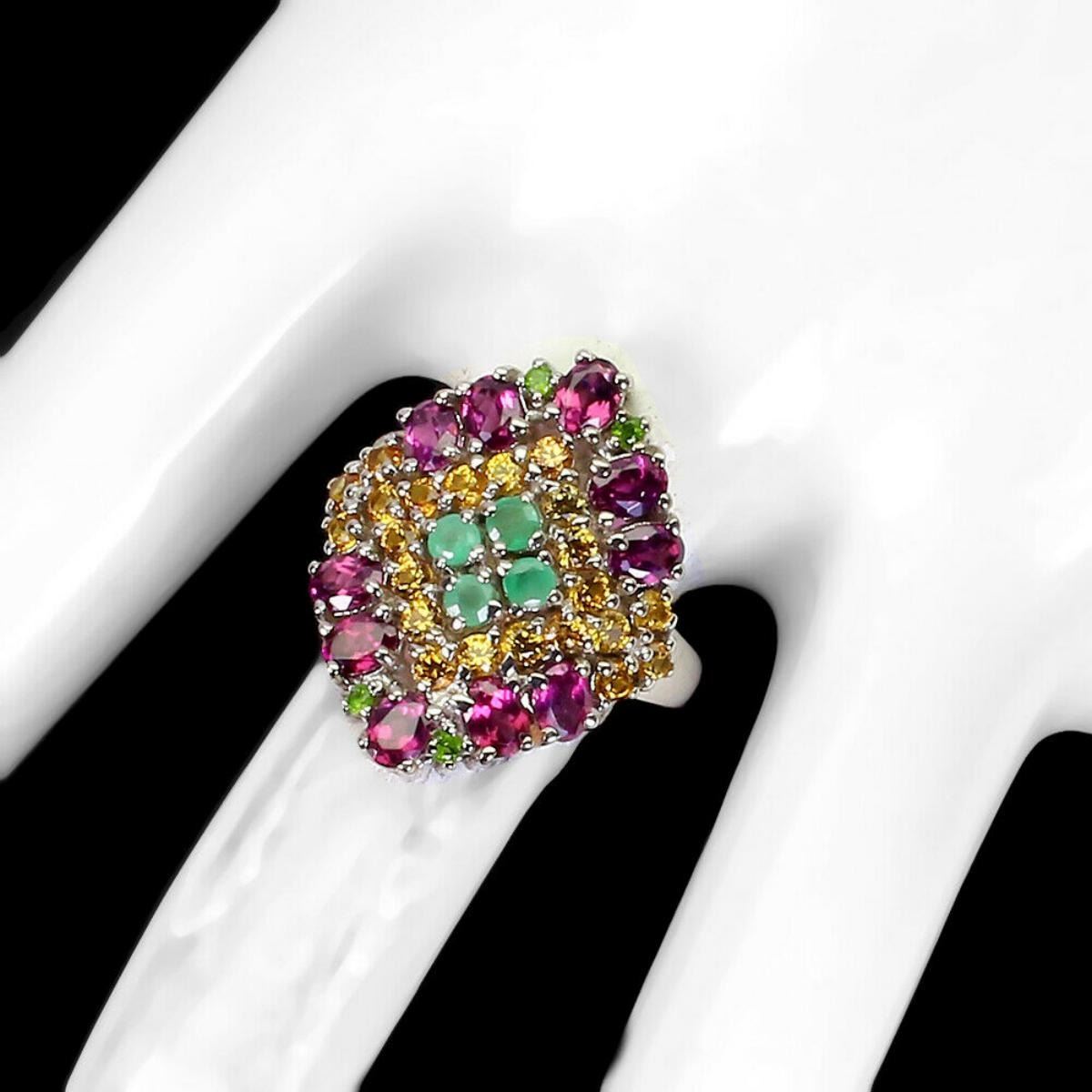 925 STERLING SILVER;PLATE-14K WHITE GOLD;RING SIZE-9(RESIZABLE);MAIN STONE-RHODOLITE GARNET;OTHER GEMS-CHROME DIOPSIDE, EMERALD, SAPPHIRE;TOTAL WEIGHT-4.61 GRAM (TOTAL WEIGHT OF SILVER + STONE);DIMENSION-* STONE 1.5 TO 4.0 X 3.0 MM.* RING SIZE 9.0* FACE RING 23.0 X 20.0 MM.;MAIN STONE SHAPE-OVAL CUT;MAIN STONE COLOR- PINK RASPBERRY;CLARITY/GRADE-IF TO VVS;TREATMENT-UNHEATED;ORIGIN-AFRICA;HARDNESS-7.0 - 7.5;