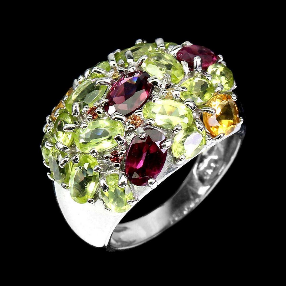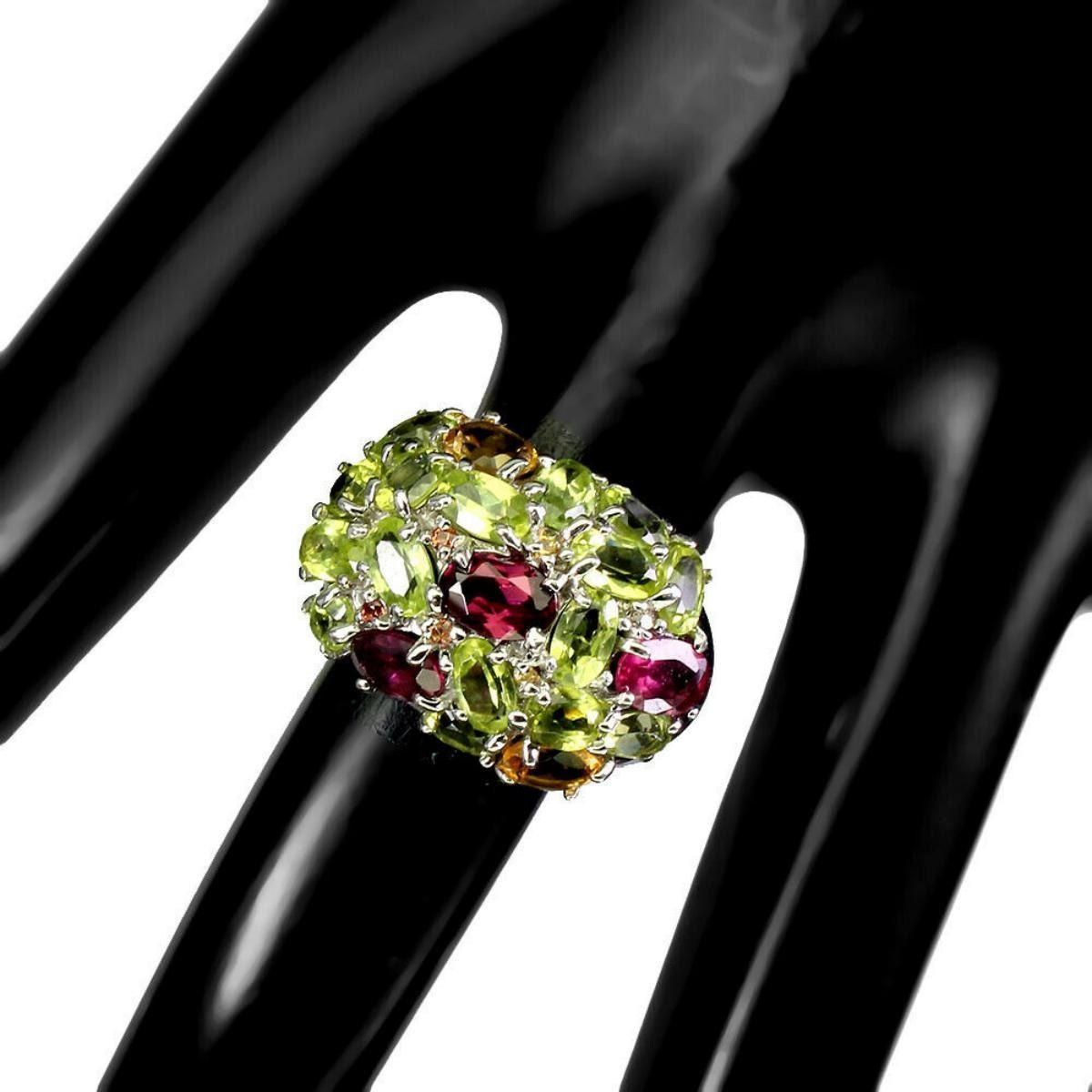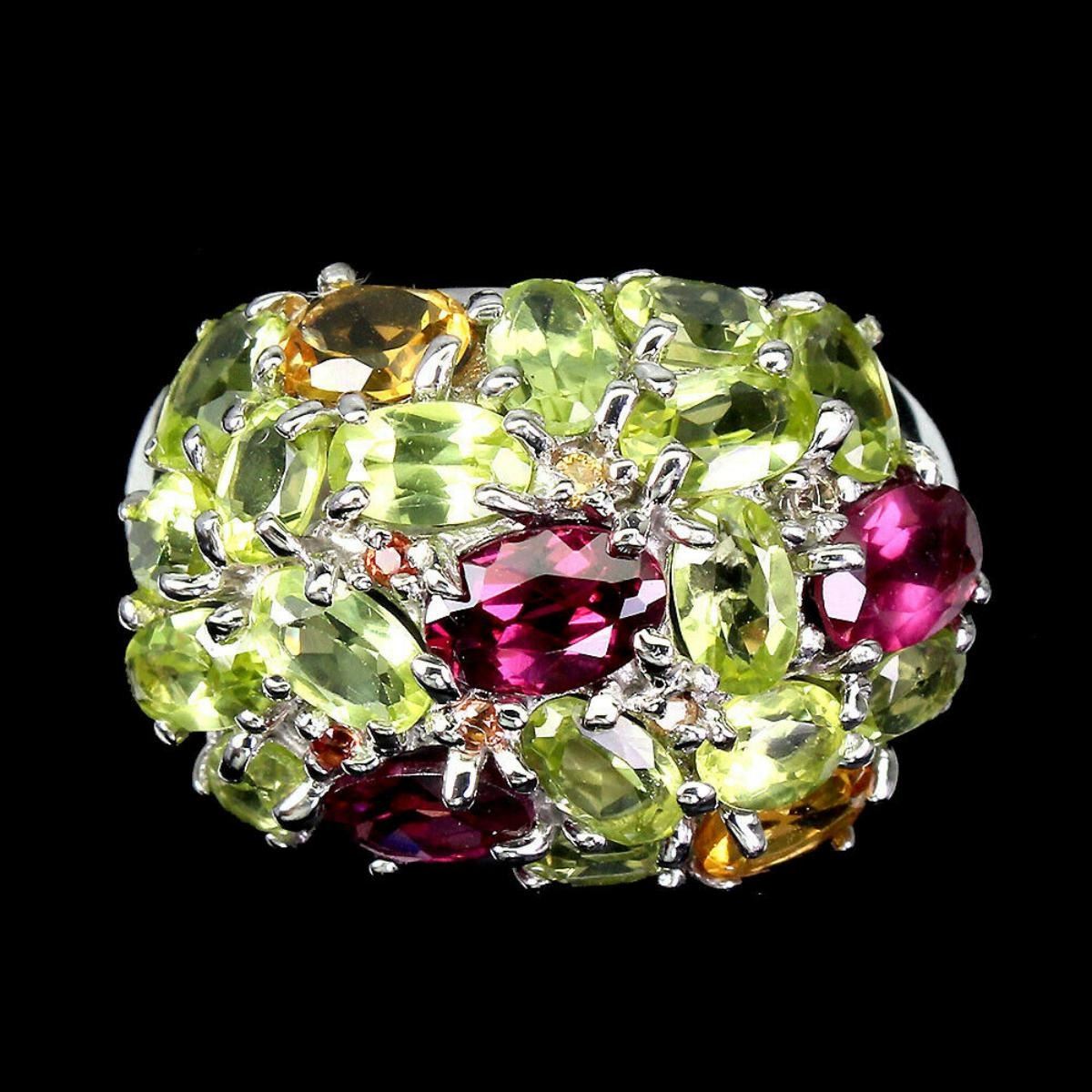 925 STERLING SILVER;PLATE-14K WHITE GOLD;RING SIZE-7(RESIZABLE);MAIN STONE-RHODOLITE GARNET;OTHER GEMS-CITRINE, PERIDOT, SAPPHIRE DIAMOND CUT;TOTAL WEIGHT-5.75 GRAM (TOTAL WEIGHT OF SILVER + STONE);DIMENSION-* STONE 1.0 TO 6.0 X 4.0 MM. * RING SIZE 7.0 * FACE RING 22.0 X 16.0 MM.;MAIN STONE SHAPE-OVAL;MAIN STONE COLOR-PINK RASPBERRY;TREATMENT-UNHEATED;ORIGIN-AFRICA;HARDNESS-7;