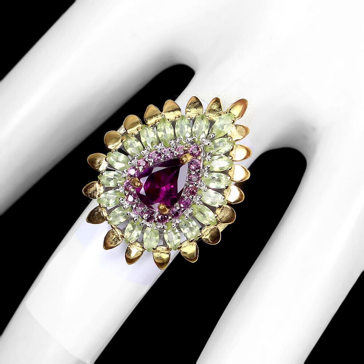 925 STERLING SILVER;PLATE-2-TONE WHITE & YELLOW 14K GOLD;RING SIZE-7.5;MAIN STONE-RHODOLITE GARNET;OTHER GEMS-PERIDOT;TOTAL WEIGHT-6.67 GRAM (TOTAL WEIGHT OF SILVER + STONE);DIMENSION-* STONE 1.0 TO 8.0 X 6.0 MM.* RING SIZE 7.5* FACE RING 27.0 X 21.0 MM.;MAIN STONE SHAPE-PEAR CUT;MAIN STONE COLOR- PINK RASPBERRY;CLARITY/GRADE-IF;TREATMENT-UNHEATED;ORIGIN-AFRICA;HARDNESS-7.0 - 7.5;
