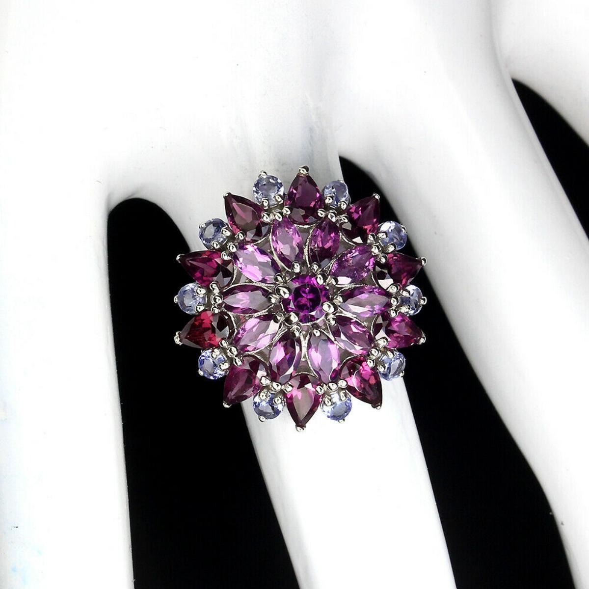 925 STERLING SILVER;PLATE-14K WHITE GOLD;RING SIZE-8 (RESIZABLE);MAIN STONE-RHODOLITE GARNET;OTHER GEMS-TANZANITE;TOTAL WEIGHT-4.64 GRAM (TOTAL WEIGHT OF SILVER + STONE);DIMENSION-* STONE 2.0 TO 5.0 X 3.0 MM. * RING SIZE 8.0 * FACE RING 22.0 X 22.0 MM.;MAIN STONE SHAPE-PEAR CUT;MAIN STONE COLOR-PINK RASPBERRY;CLARITY/GRADE-IF TO VVS;TREATMENT-UNHEATED;ORIGIN-AFRICA;HARDNESS-7.0 - 7.5;