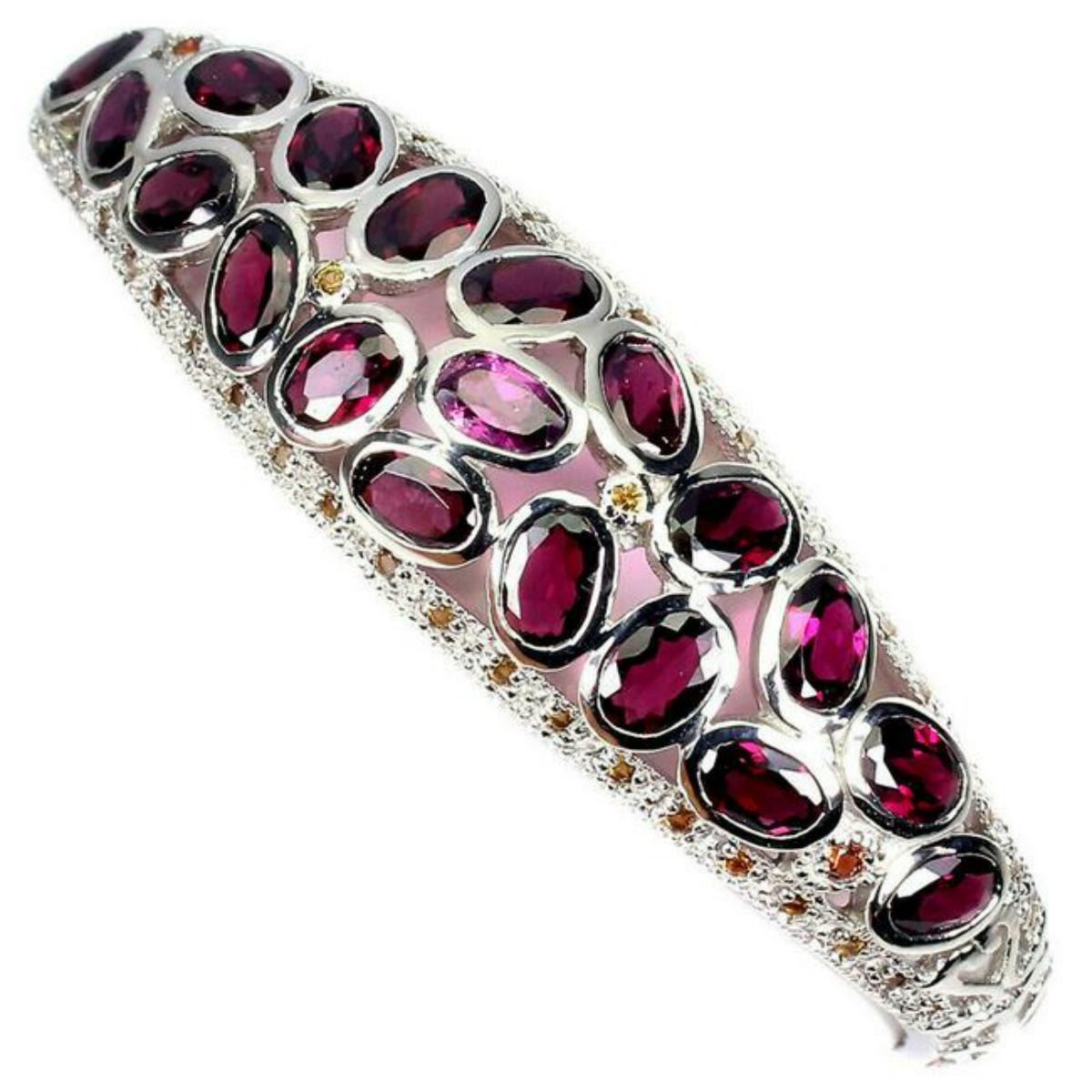 925 STERLING SILVER;PLATE-14K WHITE GOLD;MAIN STONE-RHODOLITE GARNET;OTHER GEMS-SAPPHIRE;TOTAL WEIGHT-17.18 GRAM (TOTAL WEIGHT OF SILVER + STONE);DIMENSION-* STONE 1.5 TO 6.0 X 4.0 MM. * DIAMETER 2.3 X 1.8 INCHES. * FACE BANGLE 60.0 X 16.0 MM.;MAIN STONE SHAPE-OVAL CUT;MAIN STONE COLOR- PINK RASPBERRY;CLARITY/GRADE-IF TO VVS;TREATMENT-UNHEATED;ORIGIN-AFRICA;HARDNESS-7.0 - 7.5;
