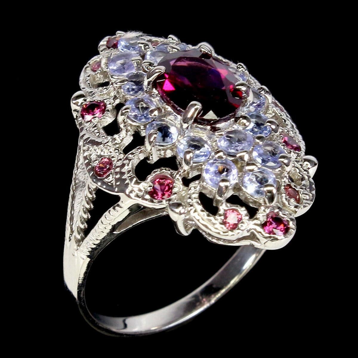 925 STERLING SILVER;PLATE-14K WHITE GOLD;RING SIZE-8.5(RESIZABLE);MAIN STONE-RHODOLITE GARNET;OTHER GEMS-TANZANITE;TOTAL WEIGHT-4.92 GRAM (TOTAL WEIGHT OF SILVER + STONE);DIMENSION-* STONE 1.5 TO 8.0 X 6.0 MM.;* RING SIZE 8.5;* FACE RING 28.0 X 18.0 MM.;MAIN STONE SHAPE-OVAL CUT;MAIN STONE COLOR-PINK RASPBERRY;CLARITY/GRADE-IF TO VVS;TREATMENT-UNHEATED;ORIGIN-AFRICA;HARDNESS-7.0 - 7.5;