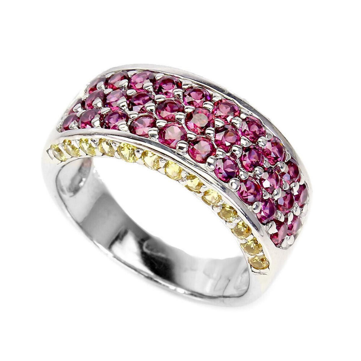 925 STERLING SILVER;PLATE-14K WHITE GOLD;RING SIZE-8.5(RESIZABLE);MAIN STONE-RHODOLITE GARNET;OTHER GEMS-SAPPHIRE; TOTAL WEIGHT-5.78 GRAM (TOTAL WEIGHT OF SILVER + STONE);DIMENSION-* STONE 1.5 TO 2.5 MM.* RING SIZE 8.5* FACE RING 23.0 X 10.0 MM.;MAIN STONE SHAPE-ROUND CUT;MAIN STONE COLOR-PINK RASPBERRY;CLARITY/GRADE-IF TO VVS;TREATMENT-UNHEATED;ORIGIN-AFRICA;