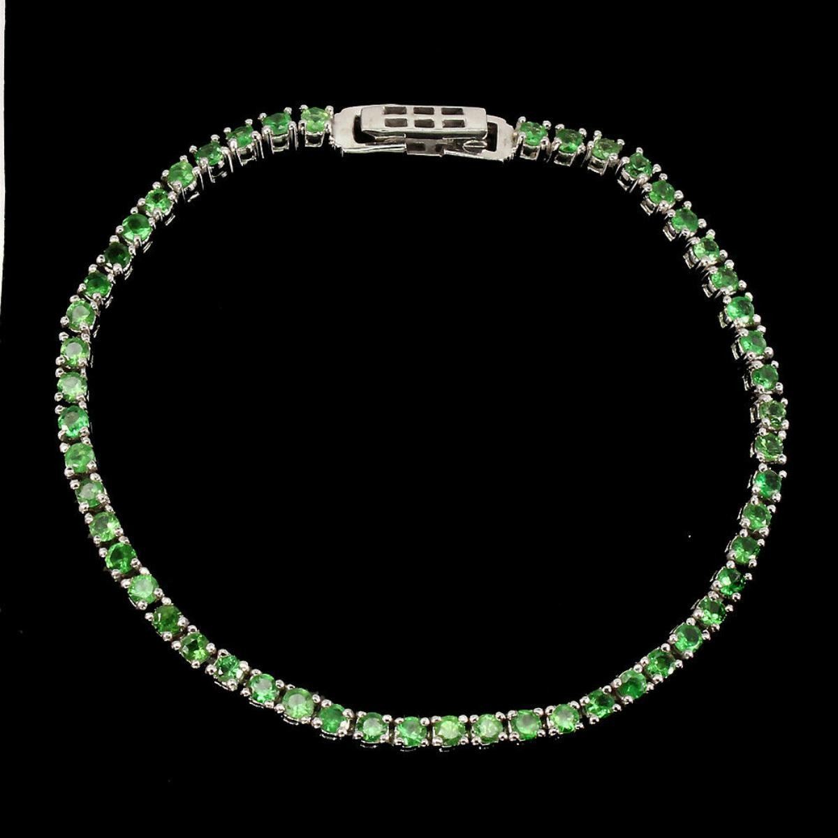 925 STERLING SILVER;PLATE-14K WHITE GOLD;LENGTH (INCHES)-7.5;MAIN STONE-TSAVORITE GARNET;TOTAL WEIGHT-9.41 GRAM (TOTAL WEIGHT OF SILVER + STONE)DIMENSION* STONE 3.0 MM. * FACE BRACELET 170.0 X 3.0 MM.MAIN STONE SHAPE-ROUND CUTMAIN STONE COLOR-TOP RICH GREENCLARITY/GRADE-IF TO VVSTREATMENT-UNHEATEDORIGINKENYA - AFRICAHARDNESS-7.0 - 7.5