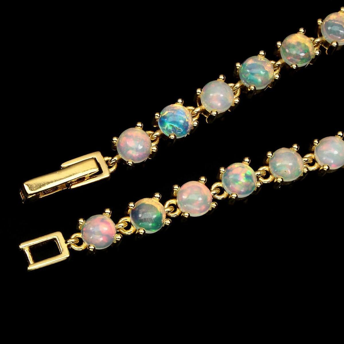 925 STERLING SILVER;PLATE14K YELLOW GOLD;LENGTH (INCHES)7.5;MAIN STONE-FIRE OPAL;TOTAL WEIGHT63.74 CT (TOTAL WEIGHT OF SILVER + STONE)DIMENSION* STONE 5.0 MM. * FACE BRACELET 170.0 X 5.0 MM.MAIN STONE SHAPE-ROUND CABOCHON;MAIN STONE COLOR-FULL FLASH;CLARITY/GRADE-TRANSPARENT;LUSTER-FABULOUS;TREATMENT-UNHEATED;ORIGIN-ETHIOPIA;HARDNESS-5.5 - 6.5;