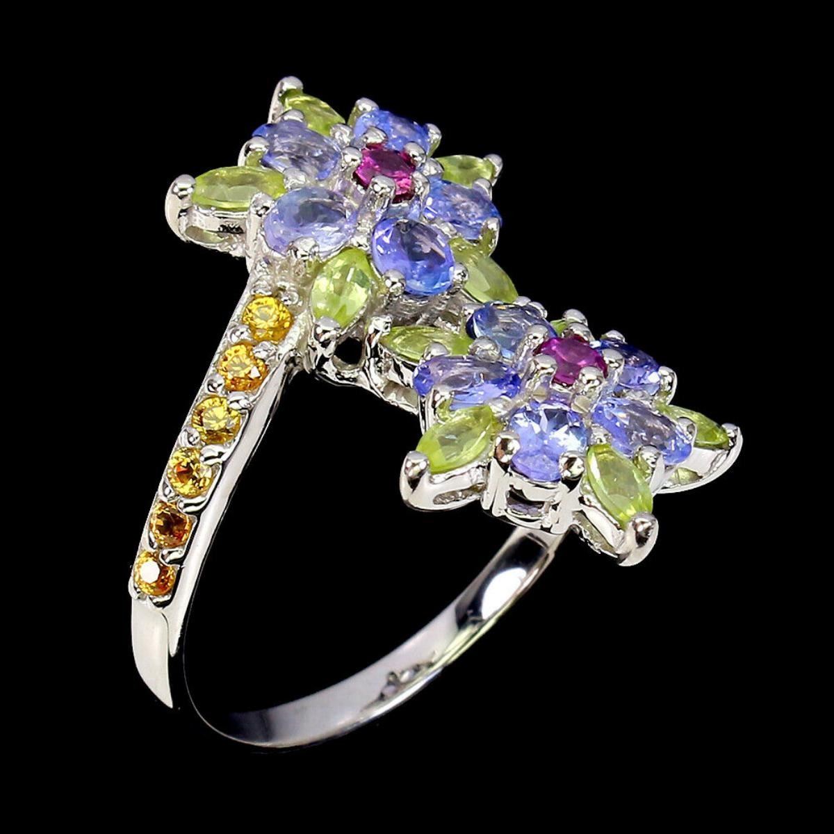 925 STERLING SILVER;PLATE-14K WHITE GOLD;RING SIZE-9(RESIZABLE);MAIN STONE-TANZANITE;OTHER GEMS-PERIDOT, RHODOLITE GARNET, SAPPHIRE;TOTAL WEIGHT-6.03 GRAM (TOTAL WEIGHT OF SILVER + STONE);DIMENSION-* STONE 2.0 TO 4.0 X 3.0 MM. * RING SIZE 9.0 * FACE RING 29.0 X 22.0 MM.;MAIN STONE SHAPE-OVAL CUT;MAIN STONE COLOR-BLUE VIOLET;CLARITY/GRADE-IF TO VVS;TREATMENT-UNHEATED;ORIGIN-TANZANIA - AFRICA;HARDNESS-7;